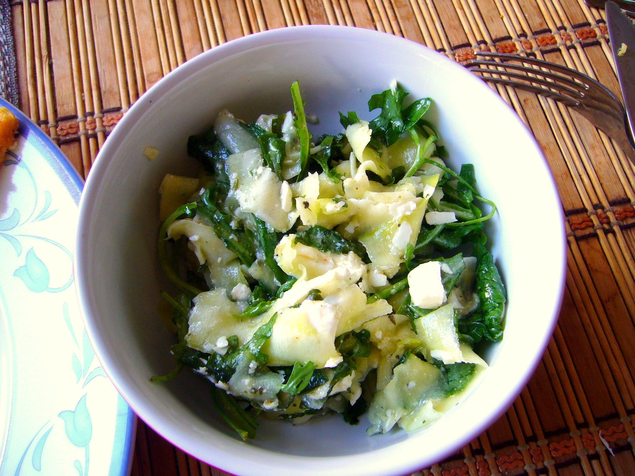 Pomocí škrabky na brambory (měli jsme novou z IKEI, takovou tu s kývající se břitvou) nastrouháme/nakrájíme dlouhé plátky cukety (já jsem zbavila cuketu vrchní tmavě zelené slupky, ale pokud máte domácí a mladou cuketku, klidně můžete nechat i se slupkou). Pokud je vnitřní část hodně semenitá, doporučuji oškrábat kolem dokola a zbylý stvol vyhodit. Promícháme spolu s dobře promytou rukolou. Mátové lístky natrháme na menší kousky a přidáme k salátu, menší lístky můžeme přidat vcelku.
