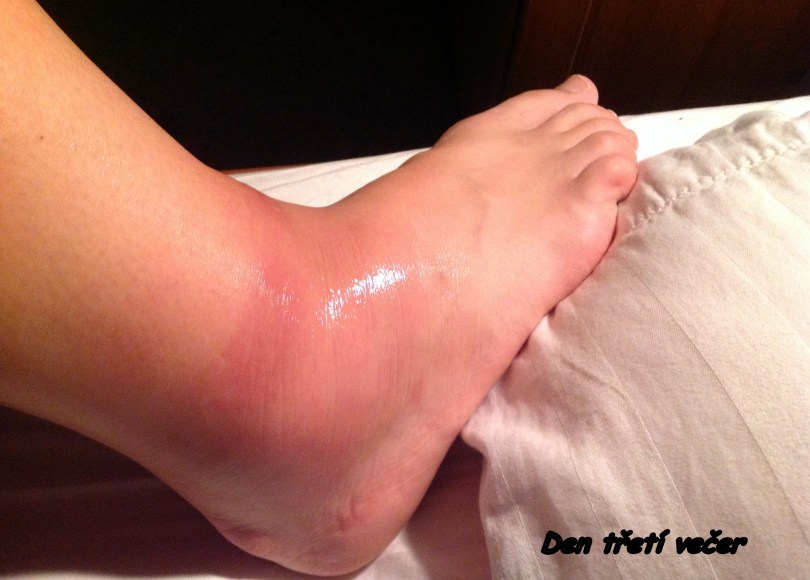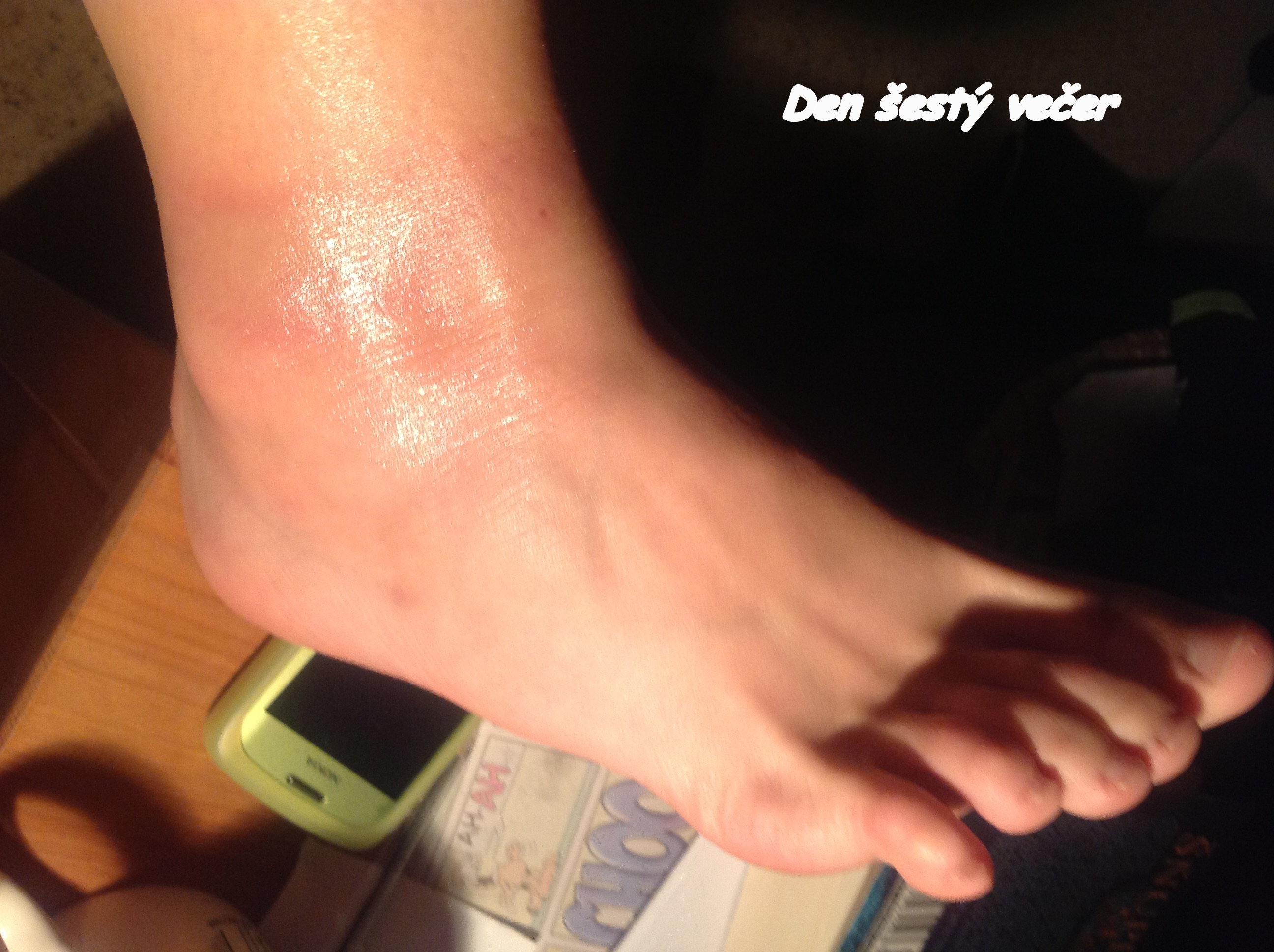 Nohu jsem první dva dny léčila anti-itchy krémem s obsahem antihistaminik, později jsem přidala hydrokortizon, jelikož noha strašně svědila. V pondělí jsem vesele jela do práce na kole a v pondělí večer už měla nohu takhle nechutnou. V úterý a středu jsem na kole nemusela a musím říct, že to asi hodně pomohlo. Nohu jsem v práci ve volných chvílích ledovala (pak to nesvědilo), čtvrtý den jsem aplikovala ATB v masti. Pátý a šestý den jsem po večerech dávala obklady ze slivovice a na noc mazala ATB (měla jsem jich málo, tak jsem mazala jen na noc). Po celou dobu jsem brala 2 různá antihistaminika a zvýšila dávku spiruliny. Včera jsem řídila, ale to už noha až na modřinu byla docela dobrá. Dnes večer noha ještě svědí, ale jinak odpuchla a mizí velmi rychle i modřina.