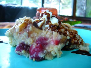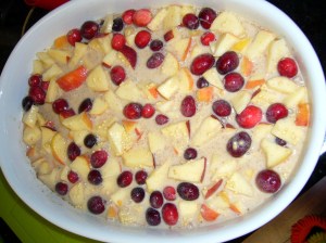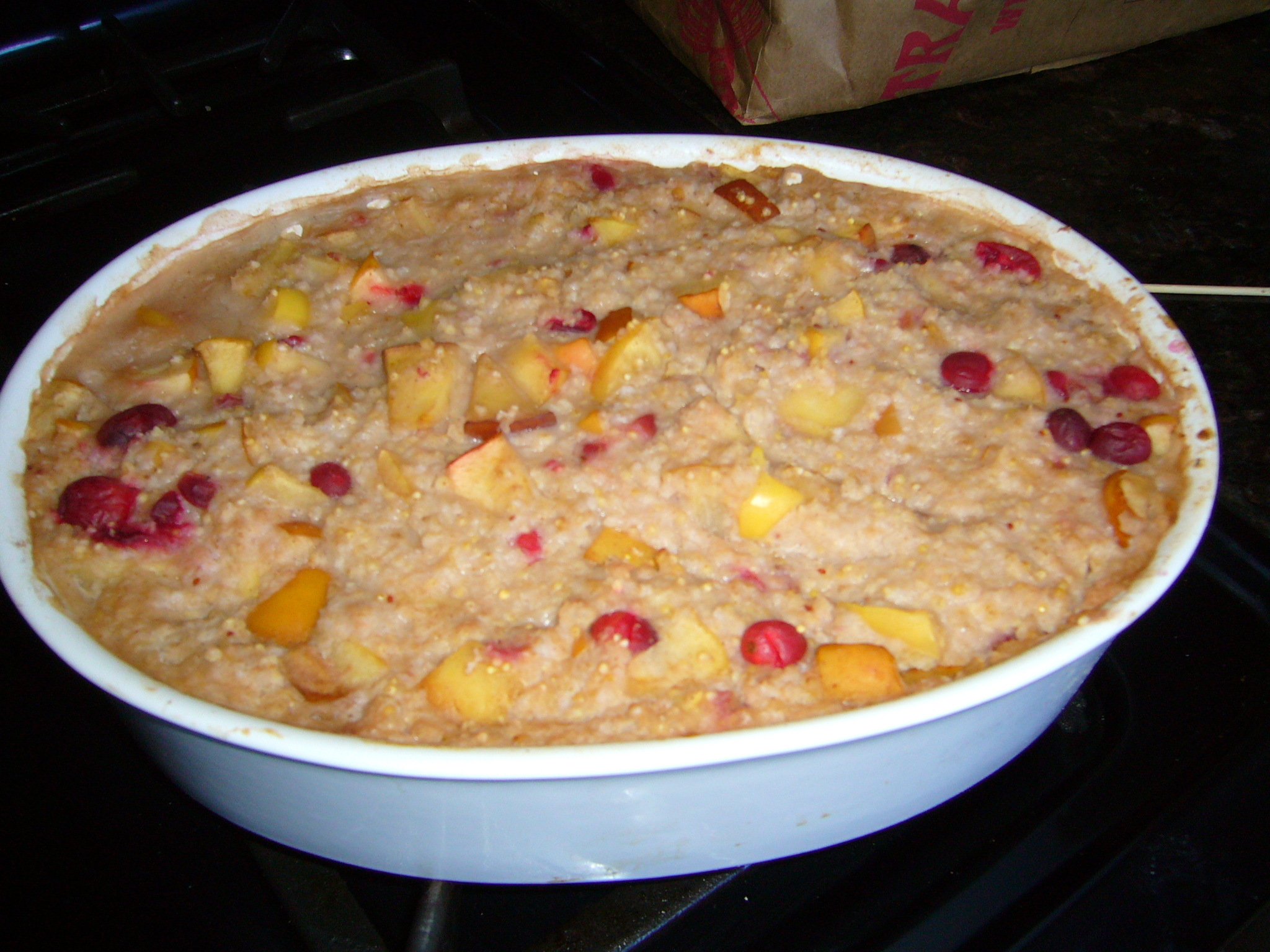 Jáhly propláchneme studenou vodou a spaříme v misce horkou vodou cca 1 minutu. Celý postup zopakujeme alespoň 3x, jinak by mohly mít uvařené jáhly lehce nahořklou chuť. Omyté jáhly přivedeme v hrnci s horkou vodou k varu a necháme pod pokličkou aspoň 20 minut dojít. Připravené jáhly umístíme do hlubší zapékací misky (já jsem použila oválnou mísu, 20 cm šířka a 28 cm délka, 5 cm hluboká). Přidáme na drobno nakrájená jablka (já používám i slupku, jelikož je v ní nejvíce vitamínů, ale pokud ji nemáte rádi, prostě jablka nastrouhejte jako na štrůdl). Přidejte dobře omyté brusinky, cukr a koření. Promíchejte a zalijte mlékem, aby bylo vše dobře zalité. Pečte v troubě při 175°C cca 30 minut. Během pečení kontrolujte, zda se nevyvařilo příliš mnoho mléka a při potřebě podlívejte vodou (pokud jste použily dobře uvařené jáhly, není potřeba podlévat). Dobrou chuť.