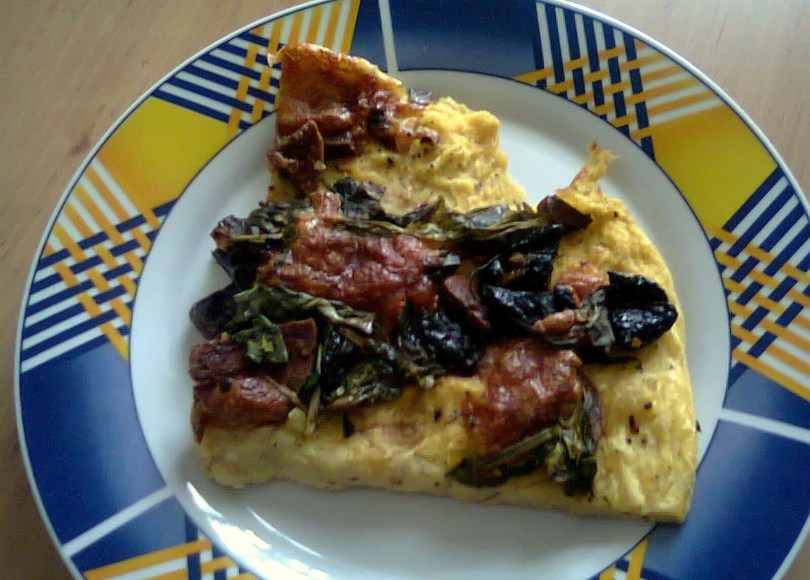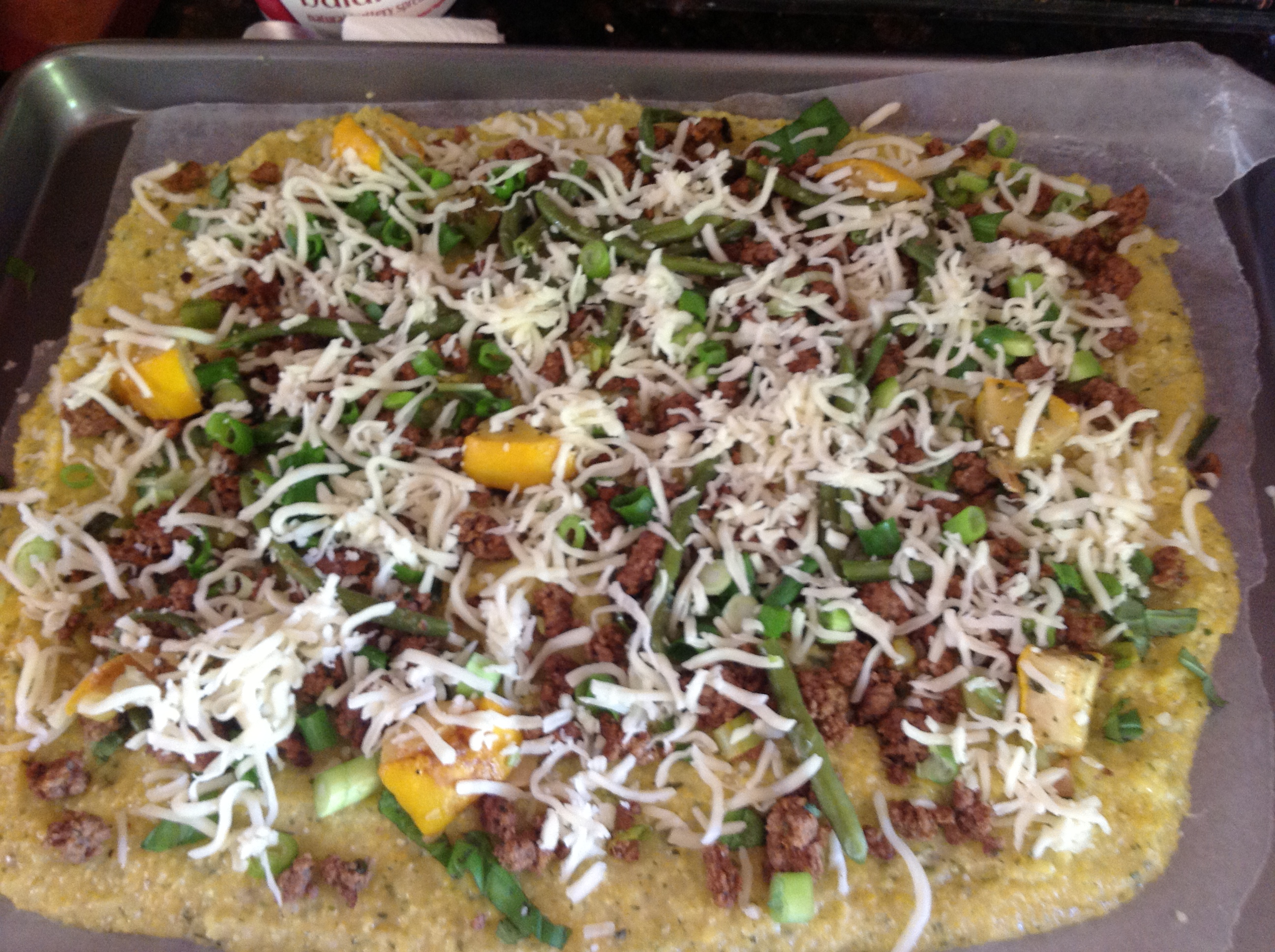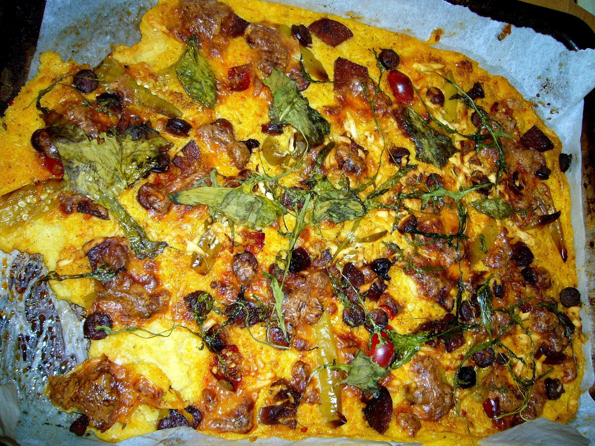 Polentová pizza s tykví, fazolkami a kousky masa pro histaminiky (nebo klobáskou, rajčátky a špenátem pro nehistaminiky)