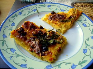 1. Dala jsem se do pečení polentové pizzy. Zatím to moc slavně nevypadá. Jestli to těsto bude mít po upečení tu správnou konzistenci, tak to asi bouřlivě oslavím 🙂