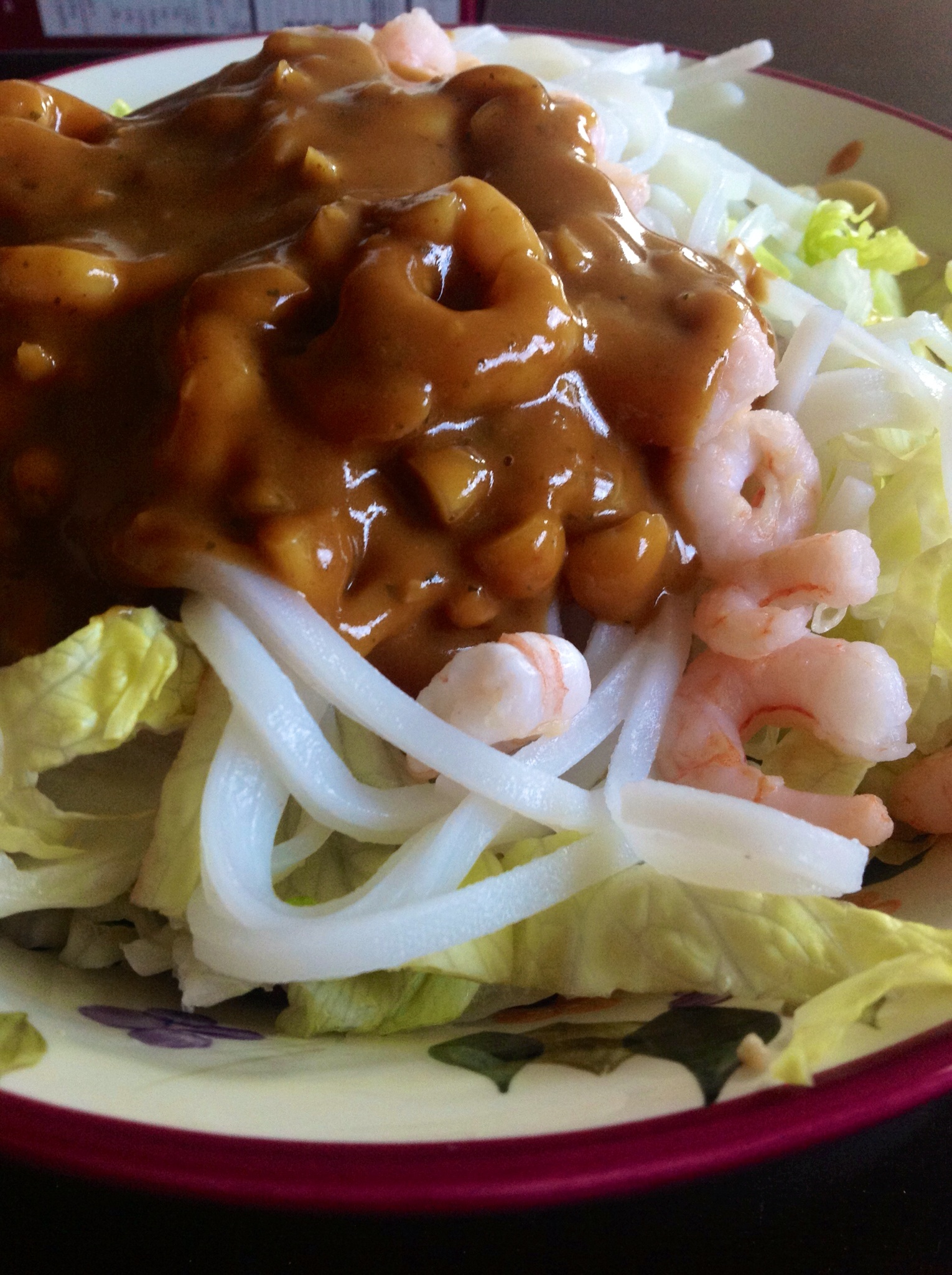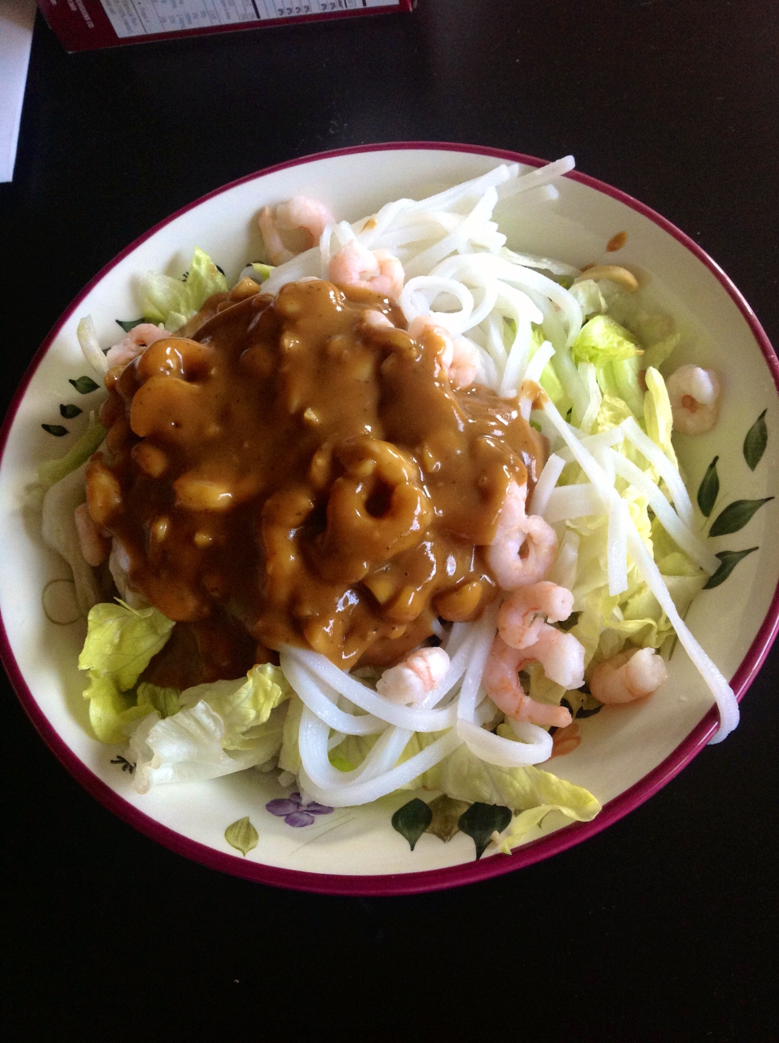 Nudle uvaříme dle návodu na obale, pro rýžové nudle je typické, že jsou velmi rychle, cca 5 minut vám bude stačit. V nepřilnavém menším hrnci smíchejte arašídovou omáčku (dle mě by se dala nahradit směsí arašídového másla ve vodě, s trouchou oleje, pálivého koření, lžičkou jablečného octu a tapiokovým škrobem na zahuštění), máslo, pár lžic vody, chilli, sekané arašídy a zahřejte. Omáčka v tu chvíli byla docela tekutá, rozmíchala jsem tedy 1 lžící tapiokového škrobu ve dvou lžicích vody a postupně vmíchala do omáčky. Mícháme intenzivně alespoň jednu minutu, než se nám vytvoří hustá lepivá omáčka (všichni jste někdy jedli v čínském fastfoodu, ne?). Krevety doporučuji velmi dobře umýt, usušit a lehce ohřát na pánvi na sucho. Salát nakrájíme na menší kousky, umístíme do talíře, na něj dáme vrstvu rýžových nudlí, posypeme krevetami a zalijeme arašídovou omáčkou. Dobrou chuť.IMG_0890