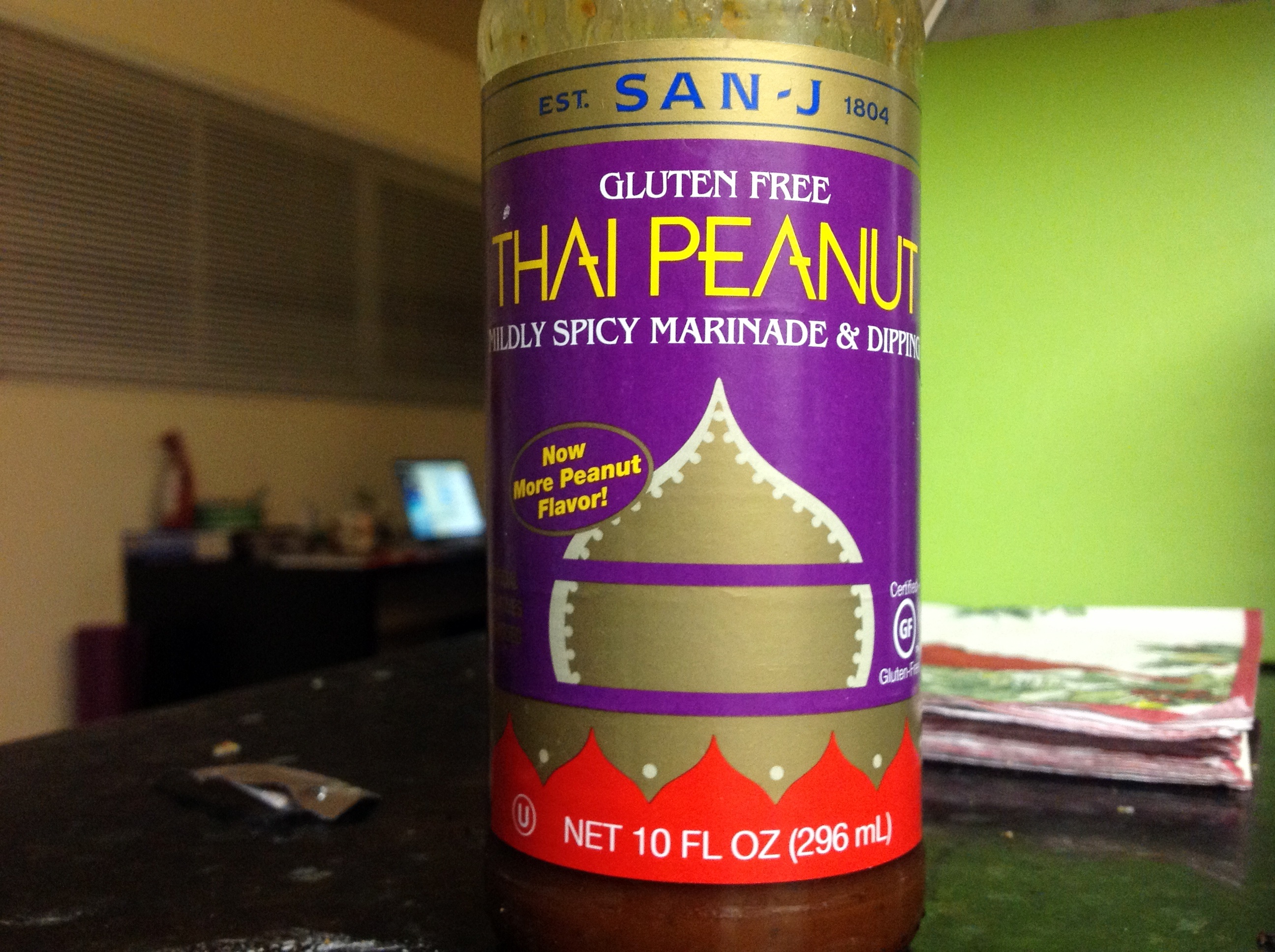 • 1/4 – 1/2 hrnku peanut sauce (arašídové omáčka, koupíte ve většině asijských obchodů, já jsem kupovala bezlepkovou San-J a použila méně kvůli obsahu sójové omáčky, jež by mohla škodit při HIT)