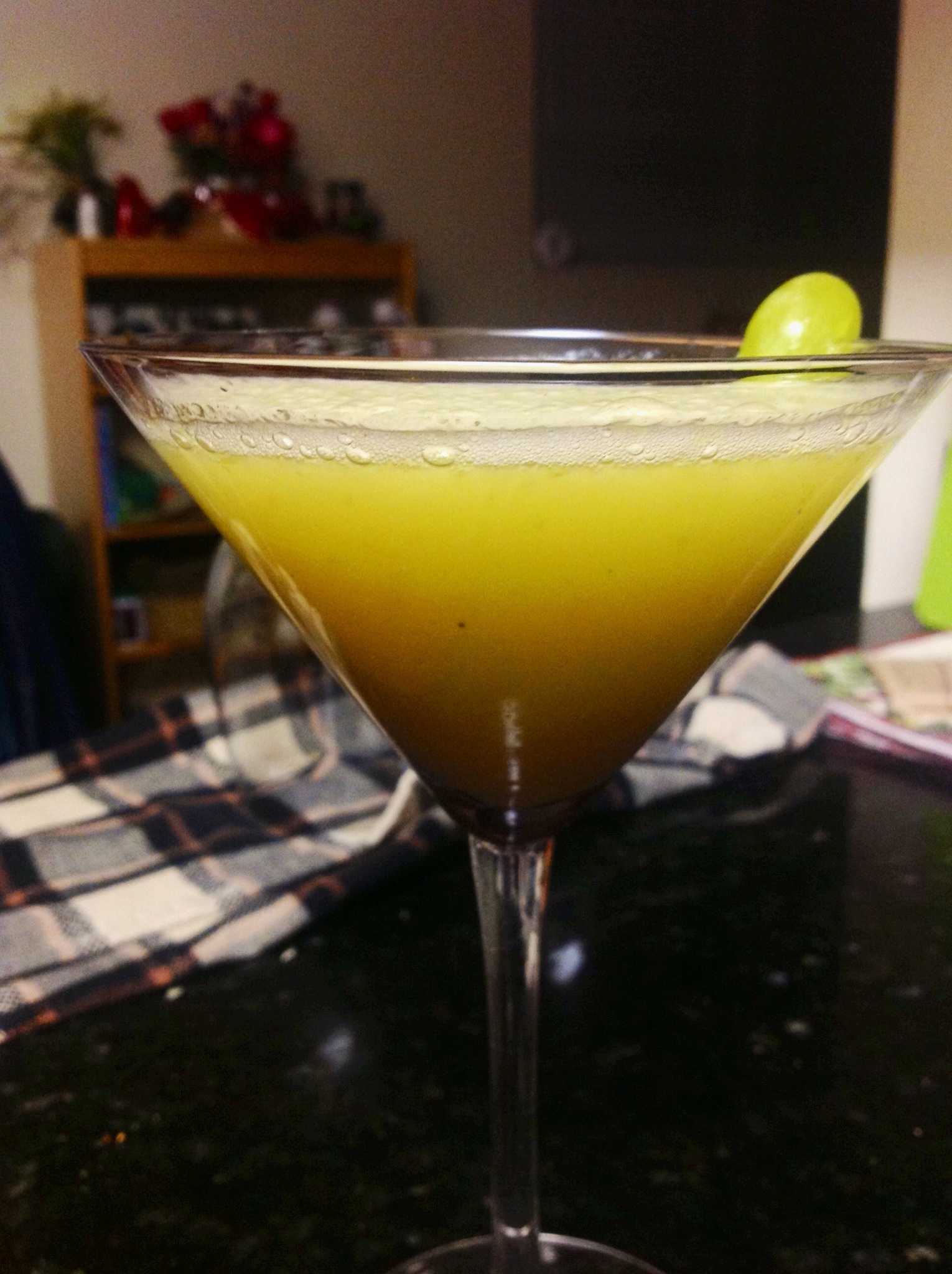 IMG_1057Všechny ingredience mimo limetkové šťávy vložíme do mixéru a řádně rozmixujeme. Můžeme přidat pár kostek ledu. Podáváme v Martini sklenicích, ozdobené hroznem a koktejl pokapeme čerstvou šťávou z limetky. Dobrou chuť. IMG_1052