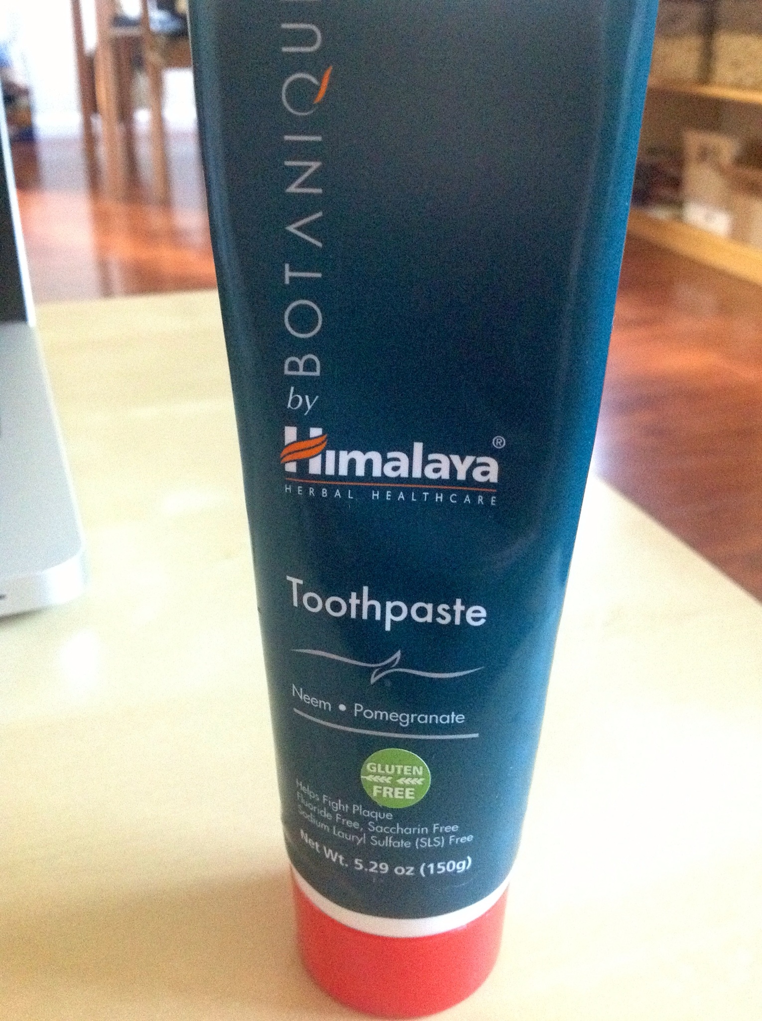 Ještě bych vám ráda ukázala novou zubní pastu, kterou jsem dostala (protože všichni víme, že po každé party je zubní pasta velmi důležitá). S předchozí pastou zmíněnou dříve (zde) jsem neměla velké úspěchy, jelikož mi zřejmě silnější koncentrace skořicové silice nedělá dobře (což se však netýká skořice v jídle). Tato pasta značky Himalaya je opět bez fluóru, protože jsem jej identifikovala jako jasného původce mé vyschlé sliznice a nepříjemných pocitů v ústech po vyčistění úst. Zubní pasta je gluten-free s obsahem neemového oleje a antioxidantu granátového jablka (neobsahuje sacharin, SLS, ale obsahuje carrageenan). Zatím mi z vyzkoušených past sedí nejvíce (čas od času vyzkouším „normální“ pastu vždy se stejným výsledkem – vyrážka kolem úst, štípání v koutcích, vyschlá sliznice). Kupodivu mi zatím nevadí fluorová ústní voda, možná kvůli kratší době kontaktu či jinému složení). IMG_1064