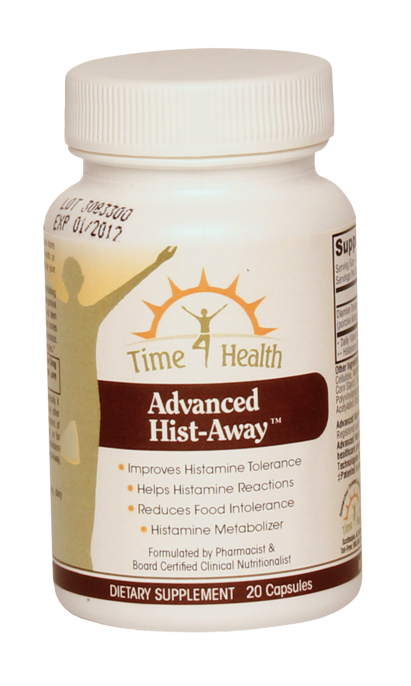 Našla jsem tedy další přípravek firmy Time4Health zvaný Advanced Hist-away. Popis u léku mi přijde mnohem serióznější než jiné. Výrobce píše, že histaminóza je důsledek akumulace histaminu v těle, ať už z důvodu získané či vrozené poruchy DAO či jiné (zmiňuje i fakt, že léky a alkohol blokující DAO). Popisuje základní příznaky jako bolesti břicha, křeče, bolesti hlavy, průjem, nadýmání, zvracení, zvýšená sekrece žaludeční kyseliny, opuchání nosní sliznice, rýma, kýchání, uslzené oči, vysoký krevní tlak, arytmie, urtikárie, svědění, červenání či bolestivá menstruace. Tolerance a tedy přípustná hladina histaminu v těle je však silně individuální záležitost.