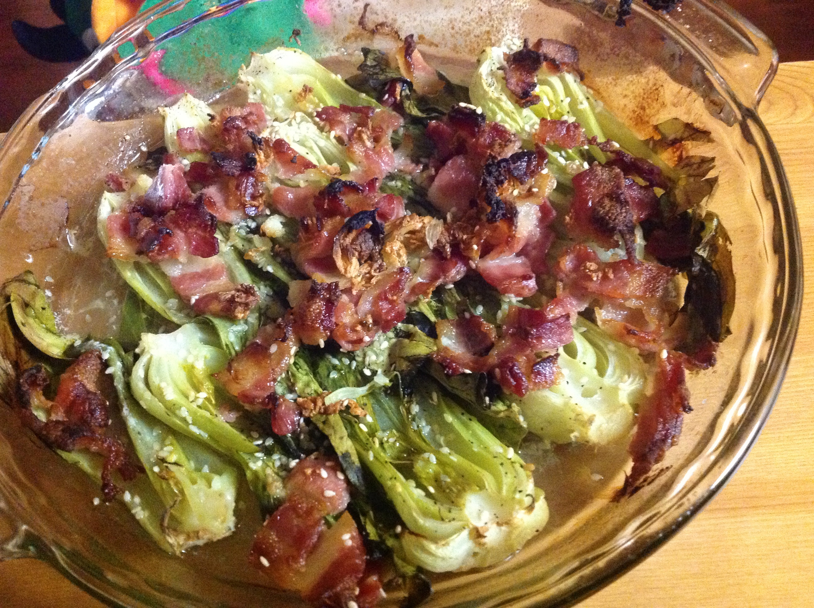 Slaninu nakrájíme na menší kousky a opečeme na pánvi na střední plamen, dokud se nevyškvaří (cca 5-10 minut, záleží, jakou máte slaninu). Mezitím bok choy omyjeme, rozkrojíme na půlky a naskládáme do zapékací misky. Lehce posolíme, opepříme, pokapeme olejem (opravdu maličko kvůli olivové chuti, tuku tam bude dost) a posypeme sezamovým semínkem. Pečeme 15-20 minut při 200°C (cca 400F), dokud bok choy uprostřed nezměkne a kraje začnou hnědnout. Podáváme s chlebíkem nebo třeba s brambory (nebo slupněte samotné). Po tomhle zeleném už nebude chtít nic jiného:)) Dobrou chuť.
