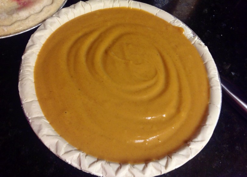 Troubu předehřejeme na 425 F (215°C). Všechny ingredience kromě krusty dáme do mixéru a pořádně spolu zmixujeme. Hotovou namixovanou směs nalejeme do připravené krusty a vložíme do rozehřáté trouby na 425F na 10 minut. Poté teplotu seslabíme na 350 F (175°C) a pečeme dalších 30-40 minut (okraje krusty musí být do zlatova a vnitřek jakoby vyschne a stáhne se). Dobrou chuť.