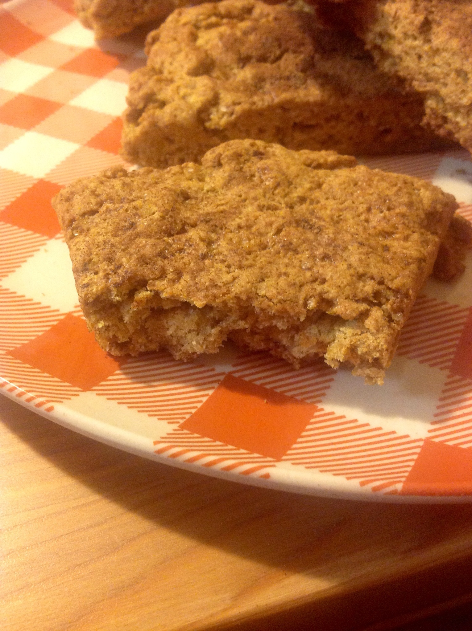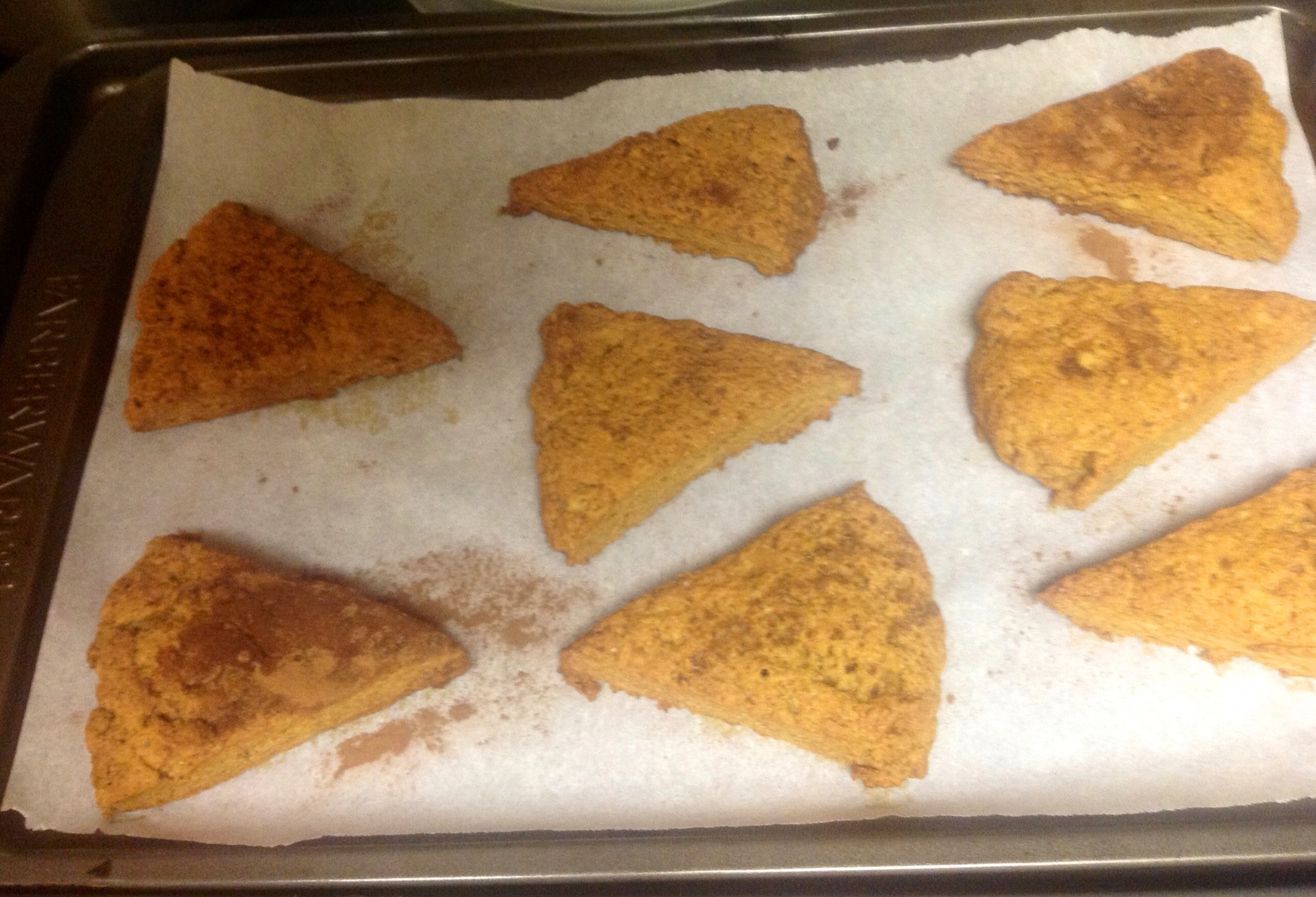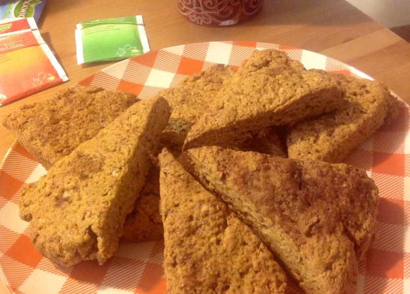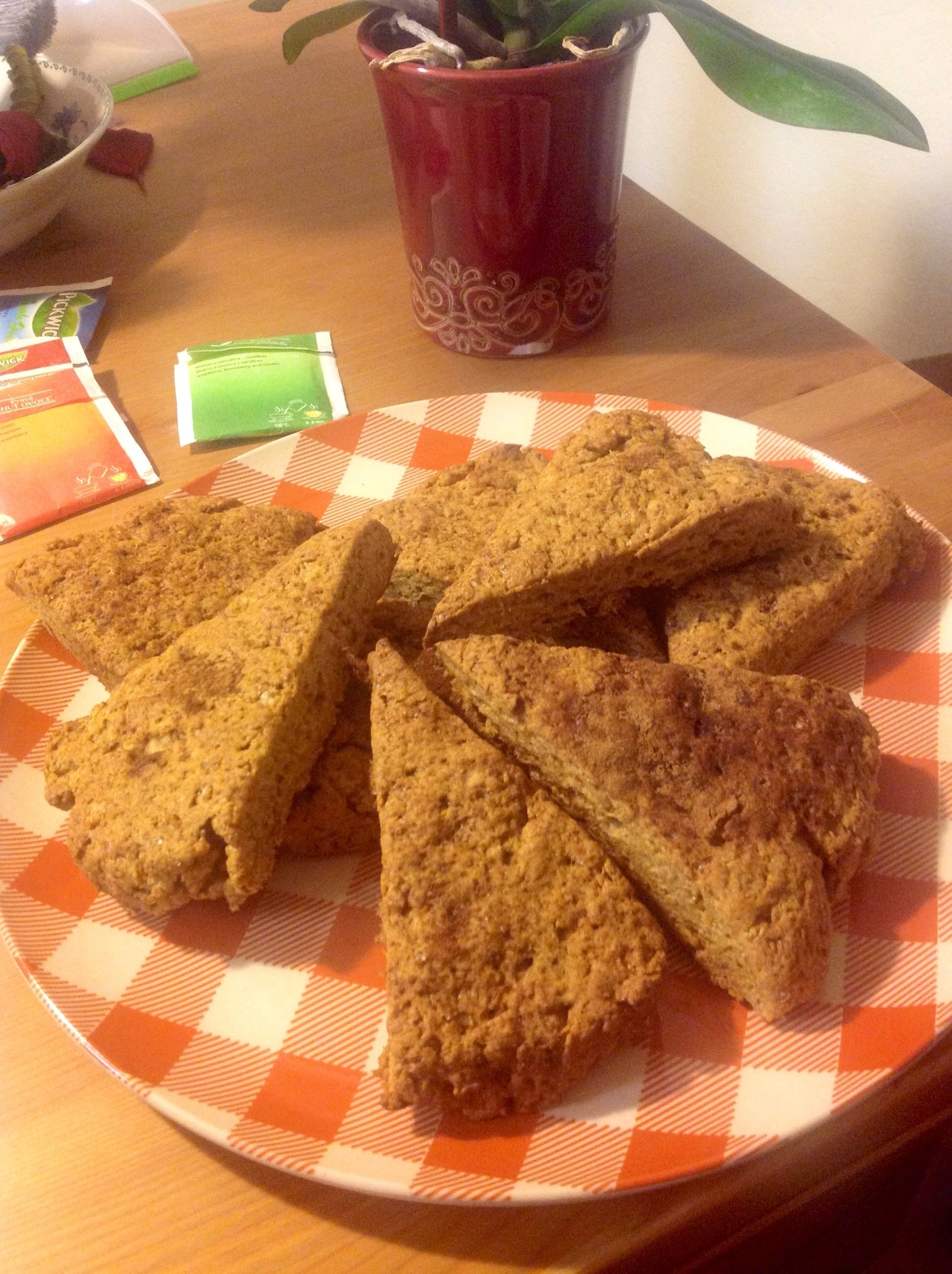 Předehřejte troubu na 425 F (220°C). Plech vyložte pečícím papírem. Budete navíc potřebovat kousek papíru na pečení posypaného moukou z hnědé rýže (či jinou bezlepkovou moukou). V míse smíchejte všechny suché ingredience a v druhé míse ty mokré ingredience (ty jsem míchala mixérem, máslo by nemělo být rozpuštěné, ale změklé, a je potřeba vše zamíchat pořádně). Přidejte mokrou směs k suché a vymíchejte husté těsto, mělo by být asi jako perníkové (pevné, nelepící se). Těsto položte na pečící papír s moukou a pomocí rukou vytvarujte placku o průměru cca 25 cm a tloušťce cca 2 cm. Ostrým nožem pak rozkrájejte placku na 8 dílků (jako se krájí dort). Trojúhelníky opatrně přesuňte na plech, mezi jednotlivými nechejte cca 2-3 cm místo, a lehce poprašte skořicí. Pečte 16 minut (nebo prostě dozlatova). Mňam jsou ještě lehce teplé, komu by připadaly příliš suché (nebo chtěl uhostit ctěnou návštěvu), lžíce řeckého jogurtu s ovocem vše doladí. Dobrou chuť.