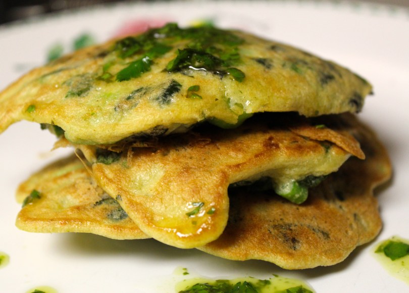 Mouku, celé vejce, olej, sůl, mletý kmín a vodu smíchejte ve větší míse, dokud nevytvoříte tekuté těsto (připomíná palačinkové). Přidejte cibulku, čili, mangold a znovu zamíchejte. Bílek našlehejte a poté opatrně vmíchejte do připraveného těsta. Na pánví ohřejte trochu oleje a osmažte z obou stran menší placičky (nabírala jsem velkou lžící).