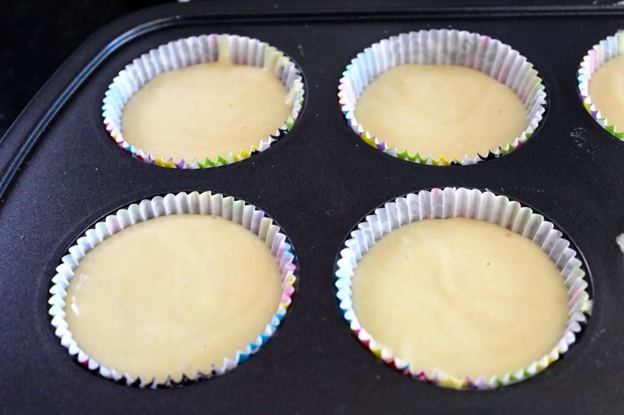 Troubu předehřeje na 425 F. Přípravíme si mufinovou formu, kterou vyložíme pečícími košíčky. Všechny ingredience na mufiny smícháme mixérem v míse a naplníme 12 mufinových forem/košíčků do cca 2/3 (či lehce pod okraj).