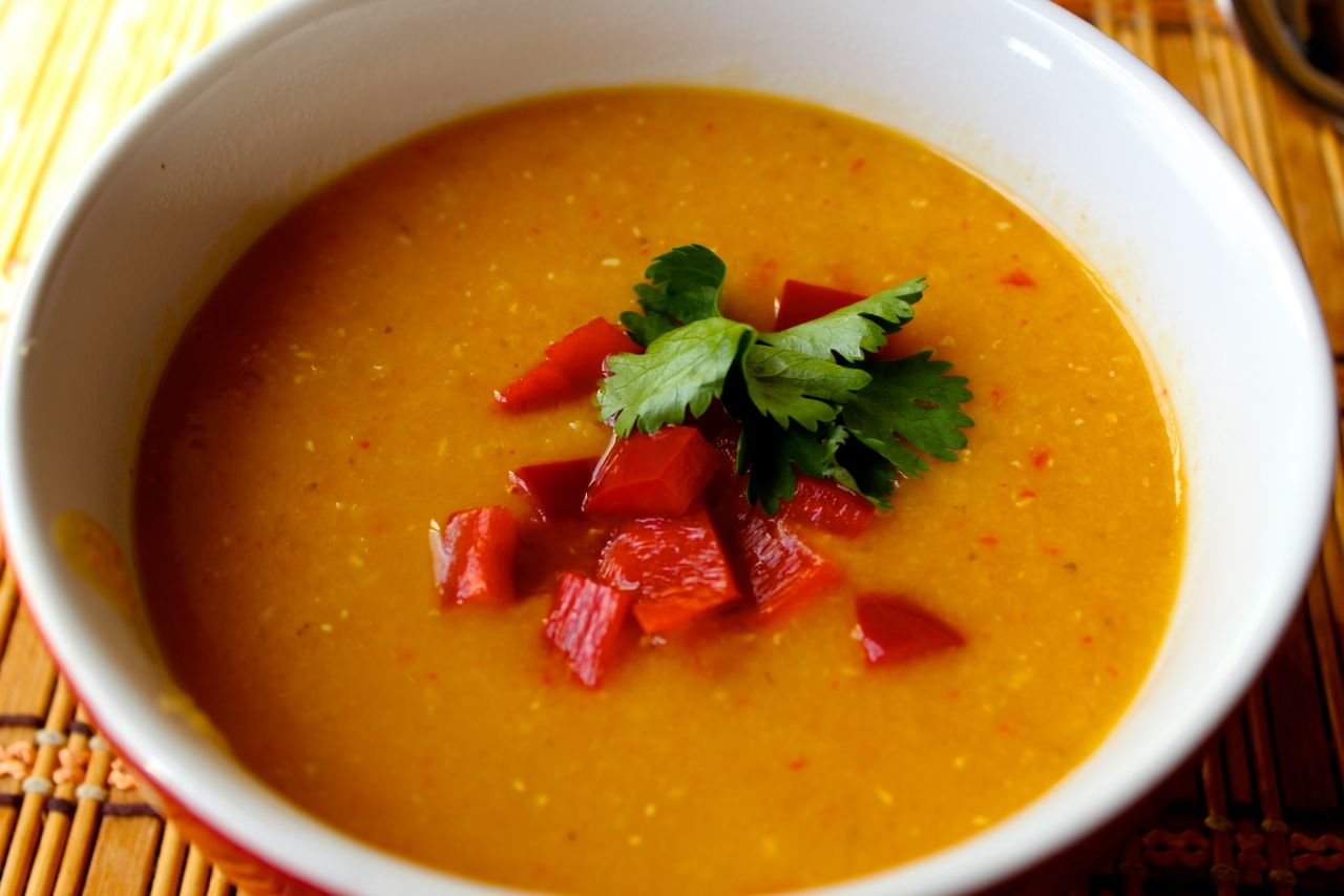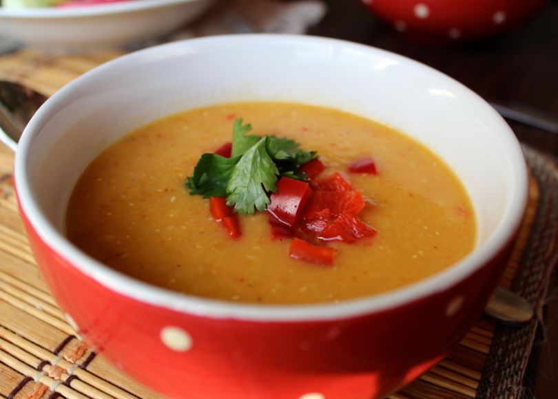 Mrkev, petržel a papriku jsem očistila a spolu s cibulí a česnekem nasekala na malé kousky v mixéru. V hrnci jsem rozehřála lžíci oleje a směs vložila do hrnce. Za stálého míchání jsem lehce opekla cca 5-10 minut. Mezitím jsem oškrábala dvě menší brambory. Brambory a čočku jsem přidala k zeleninové směsi, zalila 1 L vody a přidala koření. Vařila jsem cca 35-40 minut pod pokličkou na mírném ohni, dokud čočka i zelenina nezměkly. Vyjmula jsem bobkový list a ručním mixérem rozmixovala na velmi hustou směs. Na začátek doporučuji přidat jen 1/2 lžičky soli a dosolit dle potřeby při mixování. Požadovanou konzistenci si můžete pak sami zvolit, v této podobě se jedná o hustou krémovou polévku i bez smetany. Podávala jsem s česrtvě nasekanou kápií a lístky koriandru. Dobrou chuť.