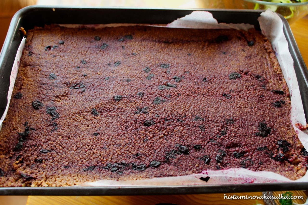 Jelikož jáhly mají na povrchu určité množství tuku, který na vzduchu oxiduje a může pak dávat jáhlám hořkou chuť, měly by se před kzždým použitím spařit. Já spařuji minimálně dvakrát – jáhly zaliji horkou vodou a nechám minutku dvě stát, scedím a opakuji. Spařené jáhly pak povařte s mlékem na plotně 35-40 minut, jáhly by se měly lehce rozvařit (po dobu vaření hlídejte, v závislosti na použitém nádobí možná budete muset přidat trochu vody). Uvařené jáhly přesuneme do misky a přidáme zbylé ingredience. Pokud jste alergičtí na kakao, doporučuji zdravý karobový prášek, ze kterého se pak dá připravit i poleva. Pokud nejste, pak vězte, že protizánětlivé kakao je dobrou volbou, zvláště pokud použijete nepražené (které si při využití ve studené kuchyni uchovává všechny svoje dobré vlastnosti). Jakmile vše vmícháte, přesuňte do plechu, napěchujte a pomocí stěrky rovnoměrně uhlaďte.