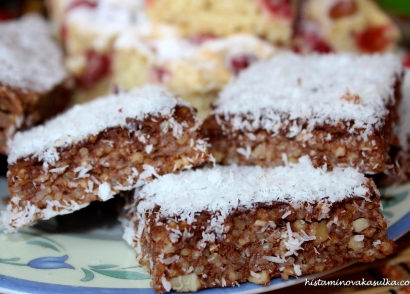 - Volitelné: čokoláda na polití a kokos (100 g bio hořké čokolády na vaření slazenou třtinovým cukrem nebo 2 lžíce karobu či kakaa, 2 lžíce kokosového tuku, 3 lžíce vody, 5 lžic třtinového moučkového cukru), nasekané vlašské ořechy