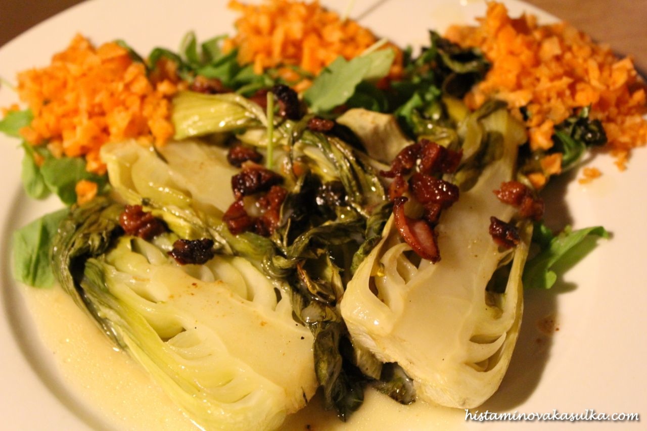 Slaninu nakrájíme na malé kostky a necháme ji vyškvařit na pánvi. Na talíř dáme omytou rukolu, nastrouhanou mrkev a přidáme upečený bok choy, který posypeme trochou slaniny. Dobrou chuť.