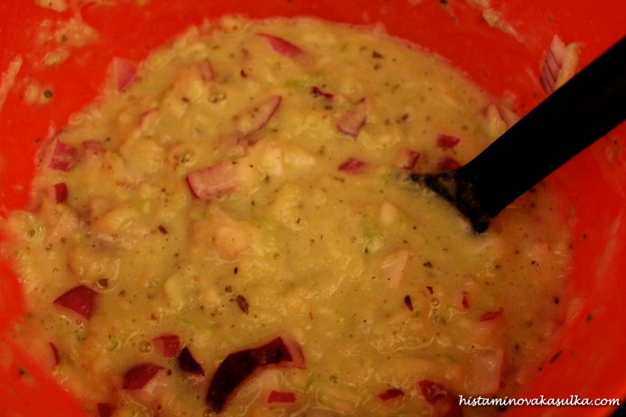 Cuketu oloupeme, rozpůlíme a vyjmeme semínka. Poté cuketu nastrouháme na hrubo, pracovní hmotnost byla cca 450 g. Přidáme vejce, nadrcený česnek, najemno nasekanou cibuli, koření a bezlepkovou mouku. Vše dobře zamícháme, vznikne nám těsto konzistence na bramboráky (polotuhé).