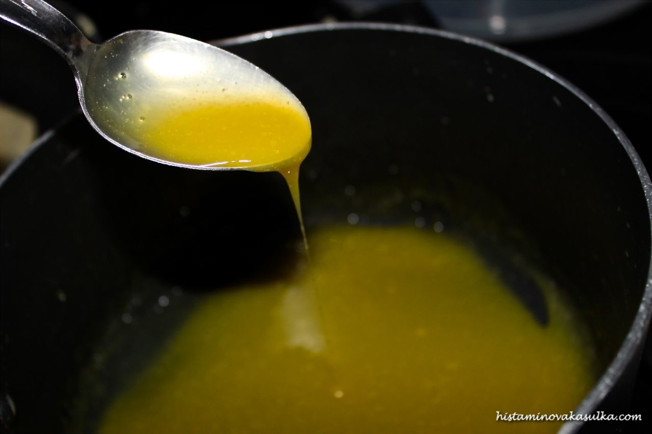Ovocnou šťávu smíchejte s moučkovým cukrem a přelijte do nepřilnavého hrnce. Jakmile dojde směs k varu, ztlumte plamen a nechte povařit cca 2-3 minutky za občasného míchání. Mazitím si v hrnečku smíchejte škrob s teplou vodou do kašičky a tuhle směs přidávejte k ovocně šťávě po lžičkách. Každou lžičku řádně promíchejte a nechte cca 1 minutu povařit, abyste viděli výslednou hustotu. Škrob přidávejte do chvíle, než se vytvoří hustá lepivá šťáva, která ze lžíce spíše odkápává než stéká. Zabralo mi to cca 5 lžíček, záleží na škrobu, který použijete. Nechte povařit další minutu a vypněte plamen (odložte z plotny).