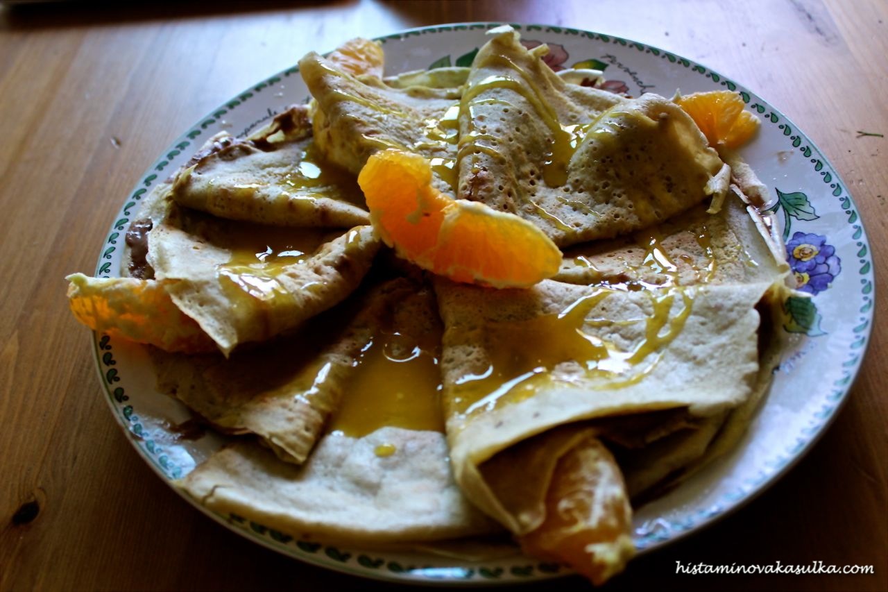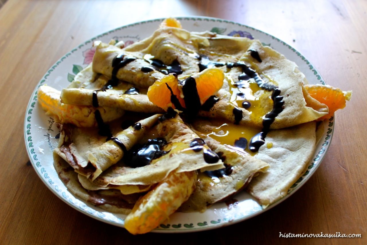 Jelikož mám velmi často tendence pracovat i o víkendu, rozhodla jsem se, že k víkendu musím přistupovat jinak – a to hned od rána. A jak lépe naznačit mozku a tělu, že je tady víkend, než sváteční snídaní? Mimo snídaně se dají palačinky použít jako výborný dezert, či dokonce celé jídlo. Já jsem pro ovocný přeliv zvolila pomeranče, jelikož jsem doma měla čerstvé ze zahrádky (och Kalifornie, jak mi chybíš) a dělala jsem tuto snídani především pro drahého. Šťáva se však dá nahradit jakoukoli jinou šťávu – ideálně čerstvou, doma připravenou (také nemám odšťavnovač, ovoce strčím do mixéru, rozmixuji na kašičku, nechám chvíli odstát a pak přecedím tlakem přes sítko). Pokud máte doma milovníka čokolády jako já, doporučuji přidat trochu nepraženého kakaa (zde), které je nejen protizánětlivé, ale také plné minerálů a vitamínů. Zkoušela jsem nahradit i karobem a kombinace s kokosem byla pořád vynikající!