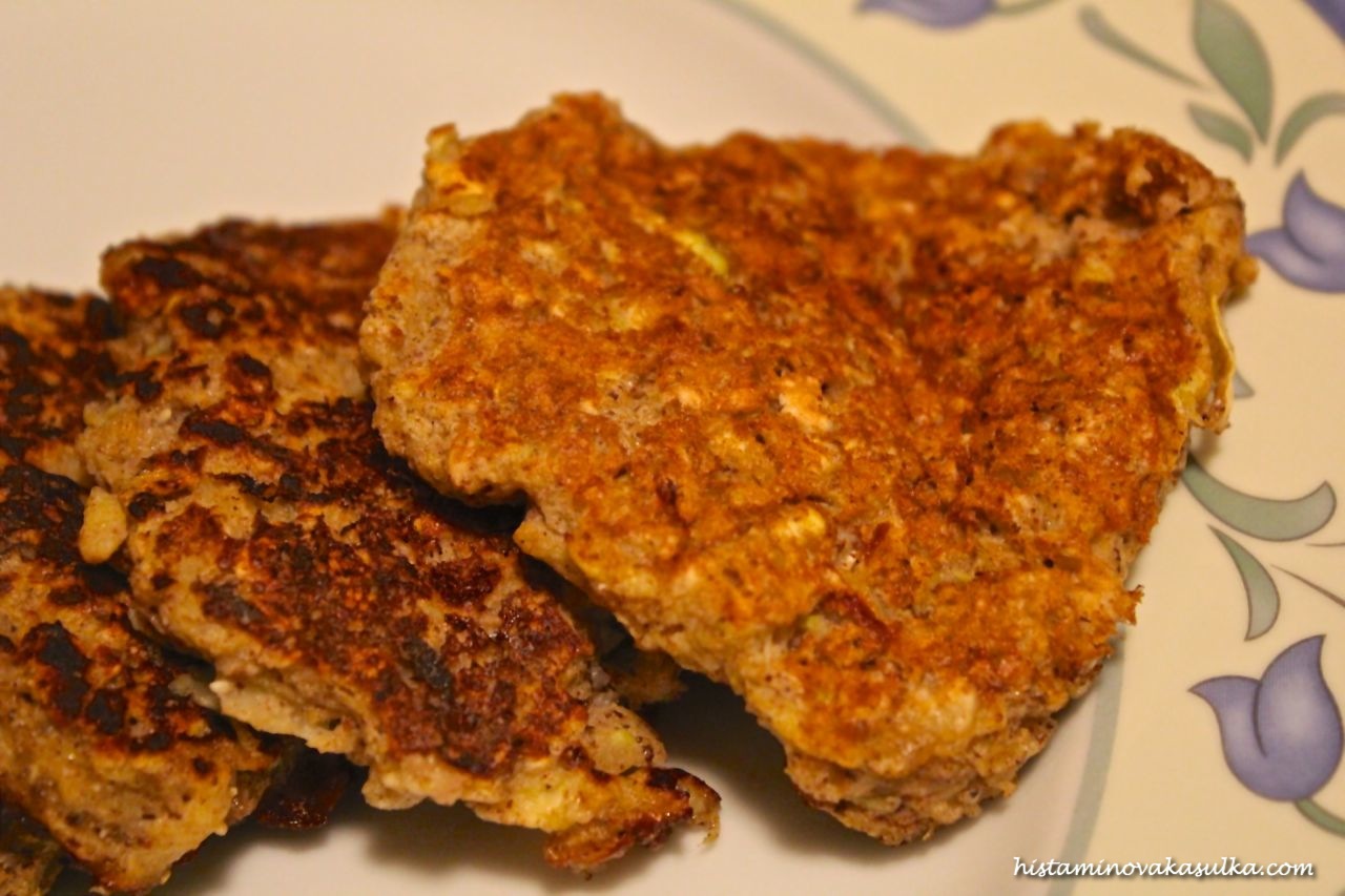 Oddělíme bílky od žloutků a bílky našleháme. Žloutky přidáme k nastrouhaným jablkům a cuketě, přidáme koření a cukr a vmícháme postupně vločky a mouku. Vločky i mouka lze nahradit jinou moukou, kterou tolerujete a máte rádi (nahradila bych za cca 3/4 hrnku). Směs se bude zdát z počátku tuhá, ale vmícháním našlehaných bílků trochu povolí (záleží na šťavnatosti jablek a kolik vaše cuketa pustí vody). Směs by měla být spíše nadýchaná. Na rozpálenou pánev dejte vždy lžíci těsta (a trochu rozplácněte), pár minut „smažte“ a jakmile začne placka zespodu hnědnout, obraťte. Placky půjde určitě upéct v troubě.