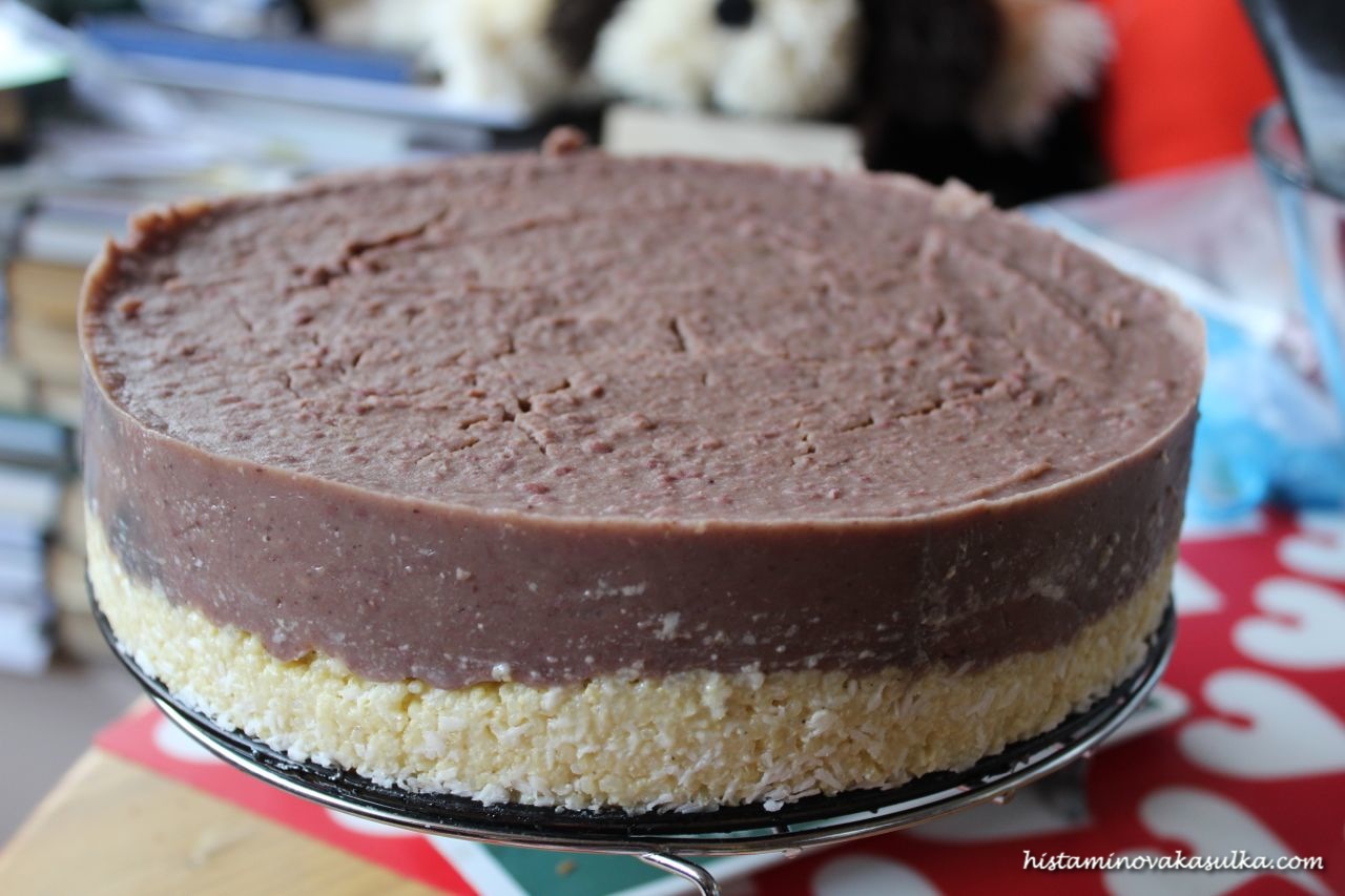 Po uvaření jáhel přidáme 4 lžíce agáve sirupu a přesuneme do předem připravené dortové formy. Já jsem dortovou formu předem vymazala kokosovým olejem a posypala 2 lžícemi strouhaného kokosu, ale nemusí být, pokud máte dobrou formu, dort se vám nepřilepí:) Takto připravené jáhly vmáčkněte rovnoměrně dovnitř, budou sloužit jako korpus. Dejte vychladnout na cca 30 minut.