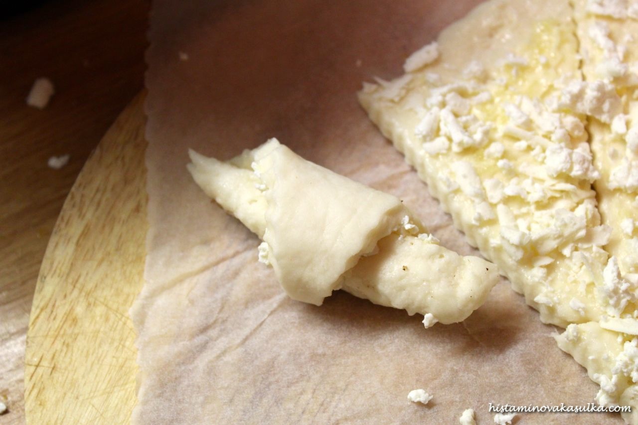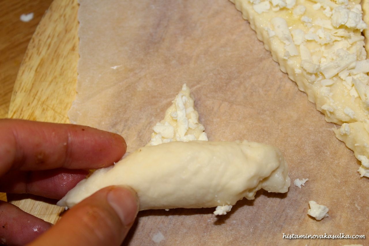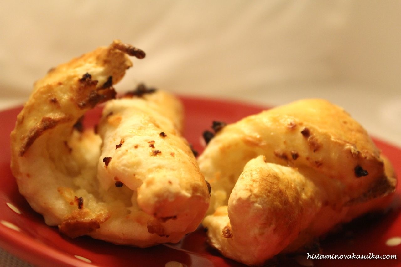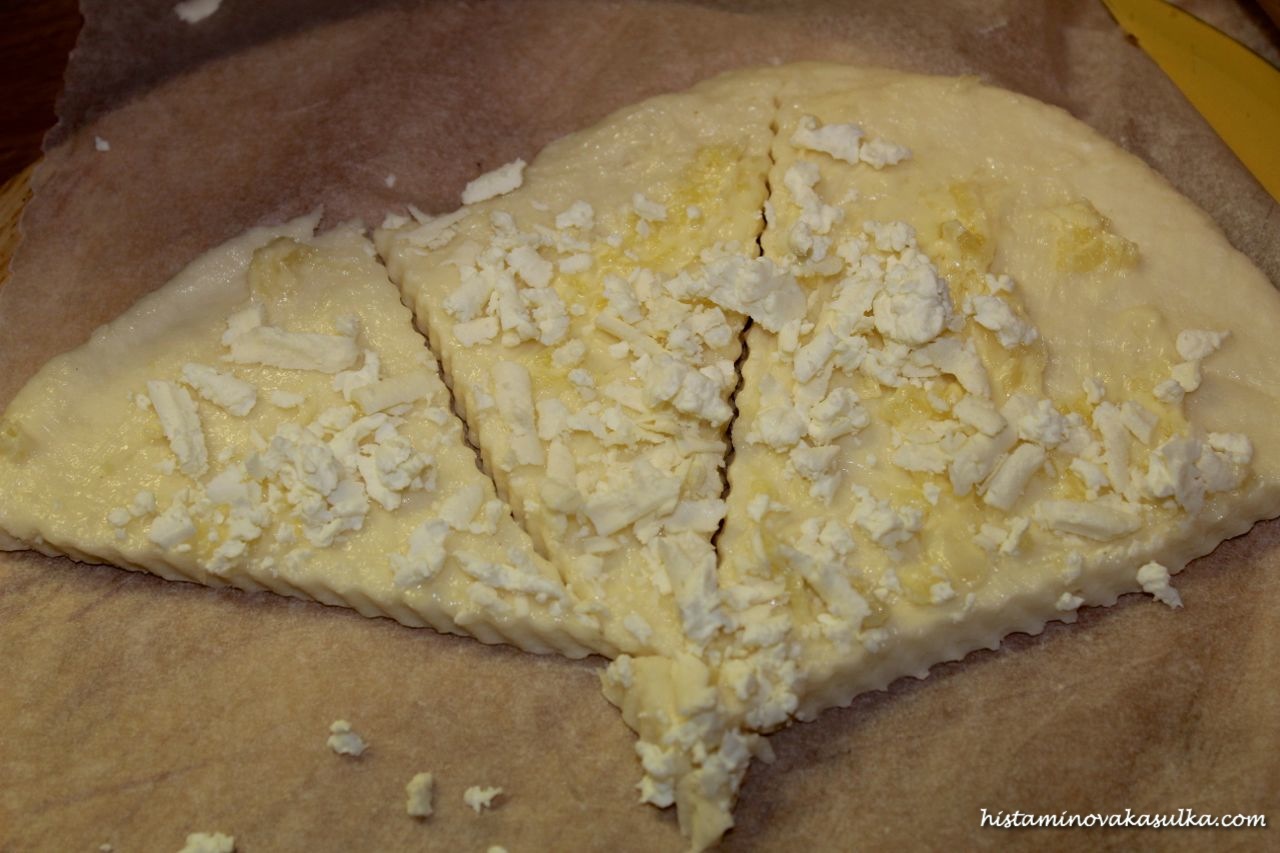 Troubu rozehřejeme na 200°C. Těsto z lednice rozdělíme na dvě části. Půlku těsta rozválíme na placku (doporučuji válet přes papír na pečení, jelikož se těsto docela lepí). Poté placku potřeme polovinou směsi másla a česneku a pokud nám nevadí mléčné, posypeme trochou sýru (použila jsem nakrájený čerstvý balkán). Placku rozdělíme na 8 dílků (na čtvrtky, které pak rozdělíme na dvě části). Vzniklý trojúhelníček rolujeme od širší strany směrem do středu, takže se nám vytvoří něco jako rulička s jednotlivými vrstvami.