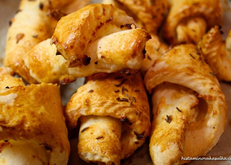 Dáme na plech a můžeme potřít rozšlehaným vejcem a posypat kmínem (není potřeba). Stejně zpracujeme ostatní trojúhelníku a zbylou část těsta. Pečeme cca 25-30 minut v závislosti na troubě, rohlíčky by měly krásně zhnědnout. Pokud budete mít čas a chuť, doporučuji vyválet co nejtenčí placku a při rolování dobře přimáčknout, rohlíčky se vám pak ani nerozšklebí. Dobrou chuť.