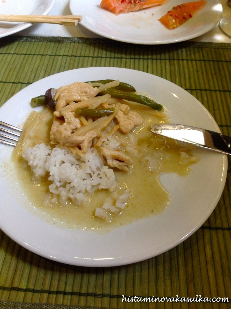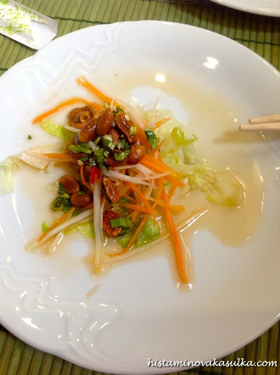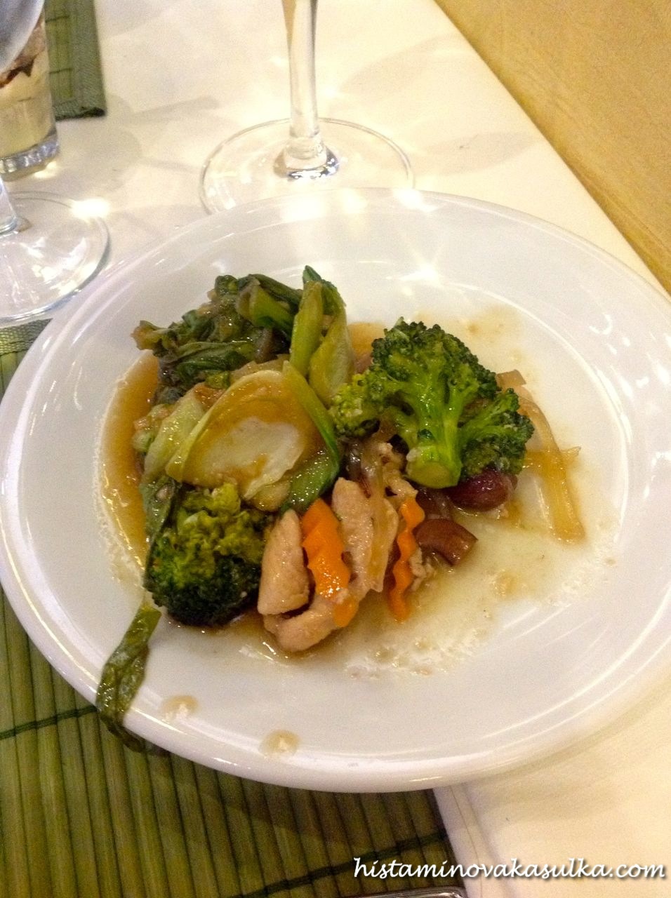 Jako předkrm nabízeli několik druhů salátů v menších mističkách, takže má host možnost ochutnat více či méně druhů. Na první místo bych dala Mu Nam Tok, tedy salát s marinovanou krkovicí, koriandrem, mátou a limetkovou šťávou (opravdu se ani histaminici nemusí bát, jedná se o kapku), ale je pravda, že jsem neochutnávala salát s krevetami a koriandrem, kde byly i nějaké ty slávky. Za zmínku stojí čerstvý losos, který byl podáván jako součást sushi od 13. hodiny (sashimi) s veškerými představitelnými dochucovadly (dala jsem si štipku jen pro ochutnání, víc jsem neriskovala). Losos byl později podáván i v podobě nigiri. Pokud se nedržíte bezlepkové diety, pak tempura, jarní závitky nebo samosa jako předkrm rozhodně neurazí. Mno a pokud jste příznivci teplých thajských polévek (hlásím předem, že já ne), měli prý výtečnou Tom Yum Kai.