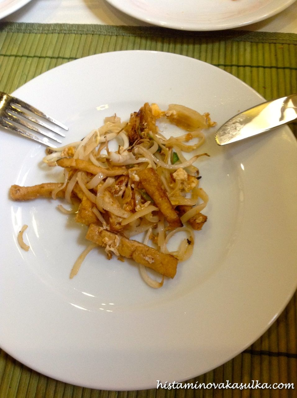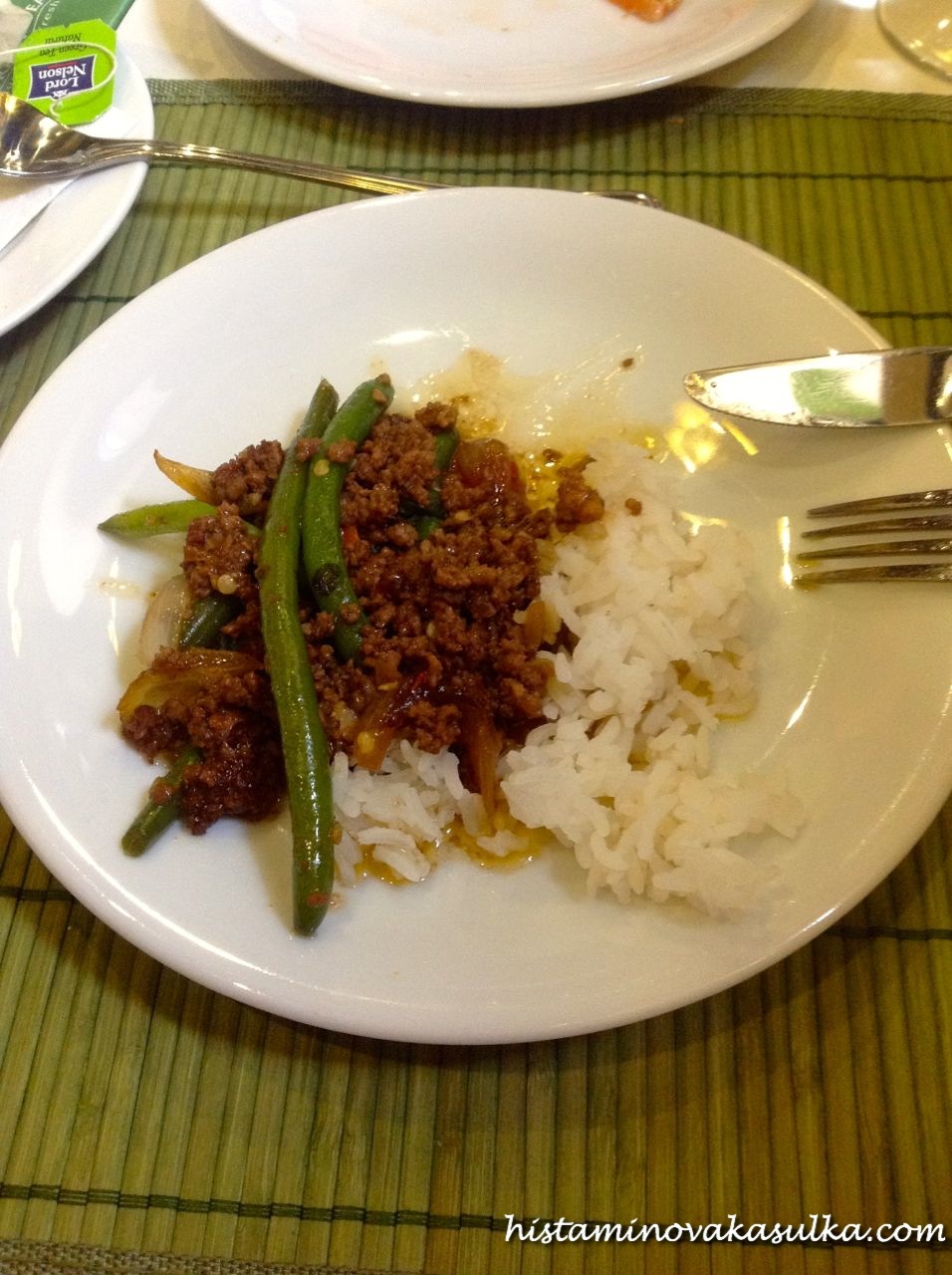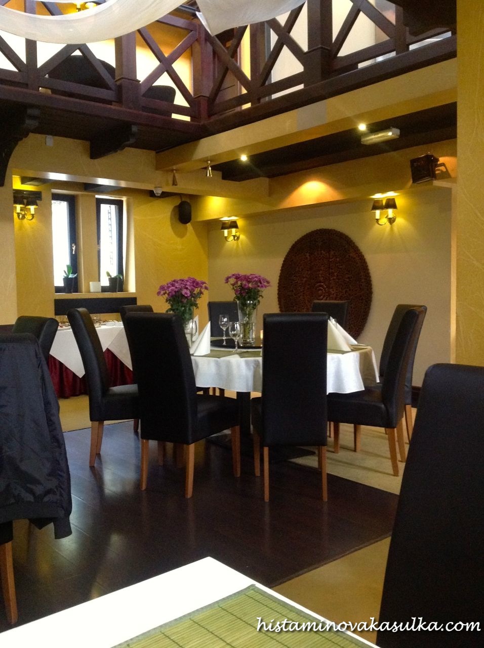 Jako předkrm nabízeli několik druhů salátů v menších mističkách, takže má host možnost ochutnat více či méně druhů. Na první místo bych dala Mu Nam Tok, tedy salát s marinovanou krkovicí, koriandrem, mátou a limetkovou šťávou (opravdu se ani histaminici nemusí bát, jedná se o kapku), ale je pravda, že jsem neochutnávala salát s krevetami a koriandrem, kde byly i nějaké ty slávky. Za zmínku stojí čerstvý losos, který byl podáván jako součást sushi od 13. hodiny (sashimi) s veškerými představitelnými dochucovadly (dala jsem si štipku jen pro ochutnání, víc jsem neriskovala). Losos byl později podáván i v podobě nigiri. Pokud se nedržíte bezlepkové diety, pak tempura, jarní závitky nebo samosa jako předkrm rozhodně neurazí. Mno a pokud jste příznivci teplých thajských polévek (hlásím předem, že já ne), měli prý výtečnou Tom Yum Kai.