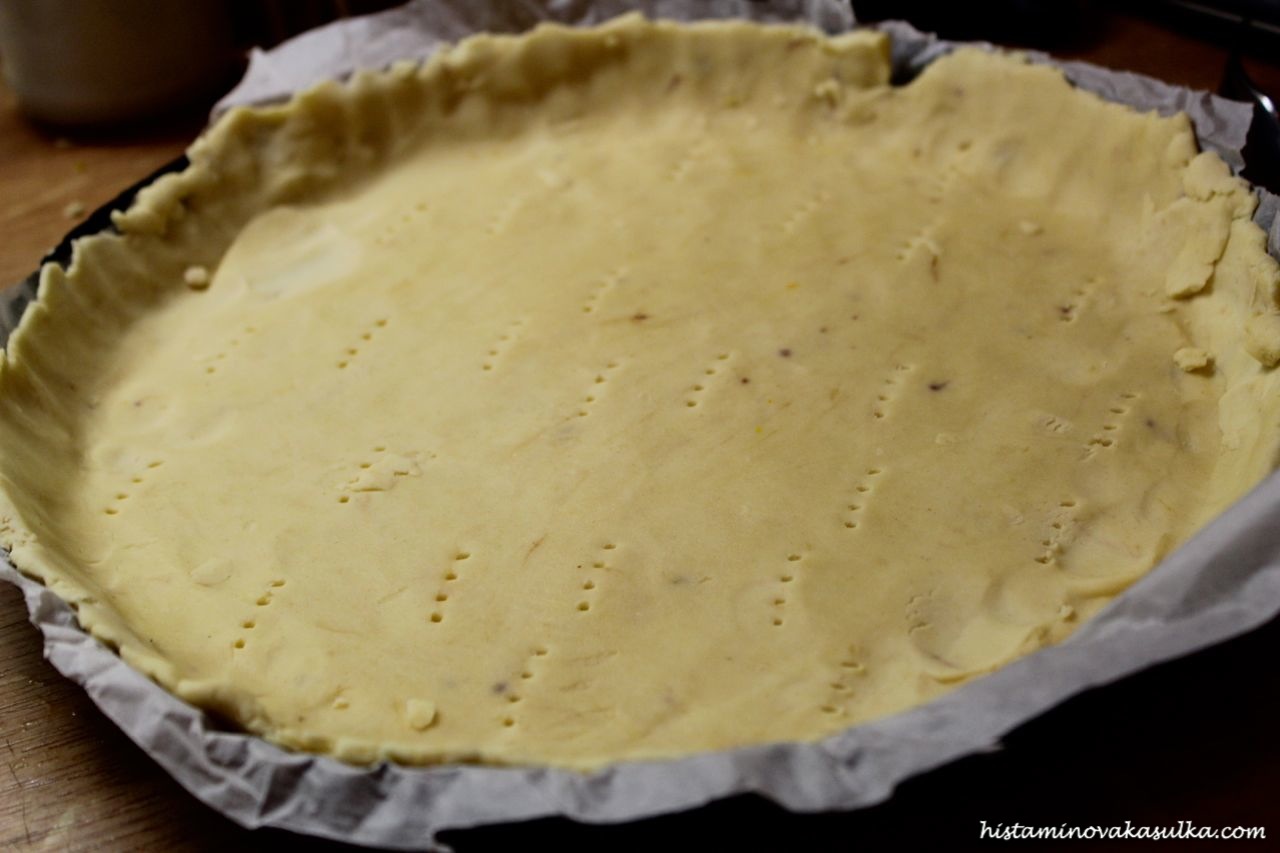 Troubu rozehřejeme na 190°C. Jakmile je těsto odležené, vyválíme z něj placku o 2-3 cm větším průměru než je dno formy. Těsto se mi po vytažení z lednice docela drobilo, tak jsem musela znova zapracovávat, nakonec se povedlo (váleno přes papír na pečení). Přesunula jsem do formy a propíchala vidličkou. Těsto zatížíme fazolkami či závažím (přiznám se, že jsem nezatěžovala, stydím se). Pekla jsem 10 minut.