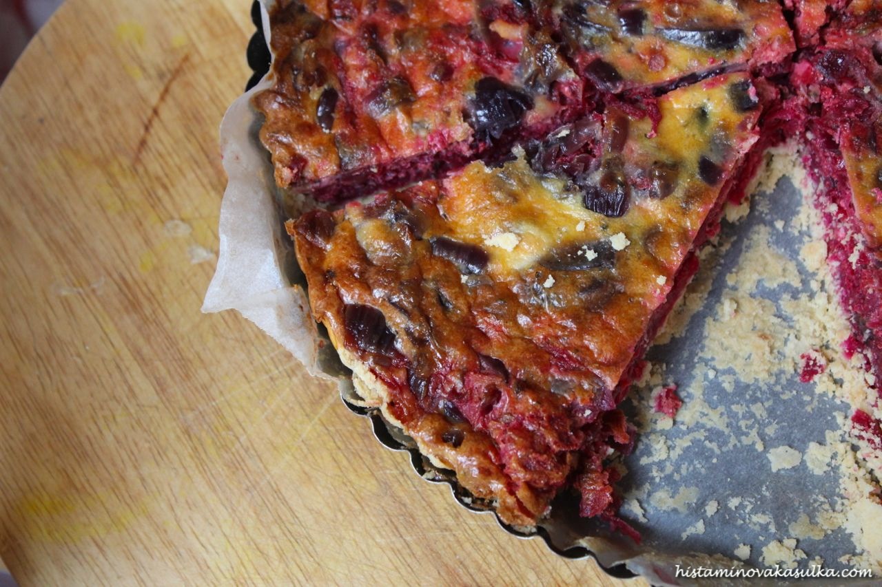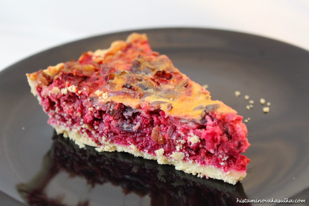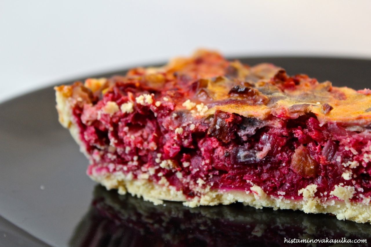 Quiche s červenou řepou, balkánským sýrem a karamelizovanou cibulkou