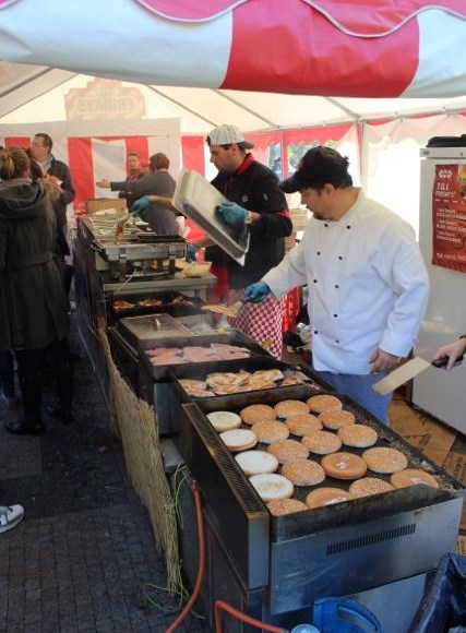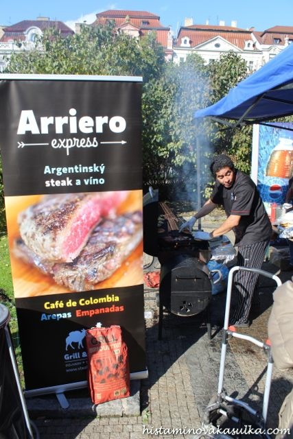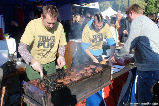 Ale ejhle. Stejný nápad mělo nakonec asi většina lidí, a tak neděle odpoledne byla spíše v duchu Festival lidských front aneb Čekání na Godota v praxi. Fronty neskutečné, když už člověk něco ulovil, neměl si s tím kam sednout. Ideální stejně bylo, aby si rovnou zase stoupl do fronty, neboť mu za tu dobu čekání zase vyhládlo. Situaci nepřidával ani fakt, že lidé mezi sebou přebíhali a „předbíhali“ ostatní, když se někdo blížil k cíli, nakonec kupoval takovou várku, že ten další čekal dalších 10 minut. To pominu fakt, že v průběhu občas došlo maso a další komplikace. Nakonec se prý prodalo 3 500 kg hovězího masa = 23 tisíc burgerů, tudíž spokojených odcházelo lidí asi dost. Je pravda, že atmosféra samotná nebyla zlá, jelikož bylo co pít (vypilo se prý více než 70 sudů piva a 10 tisíc nealko nápojů) a tekutý chléb lepší než nic.