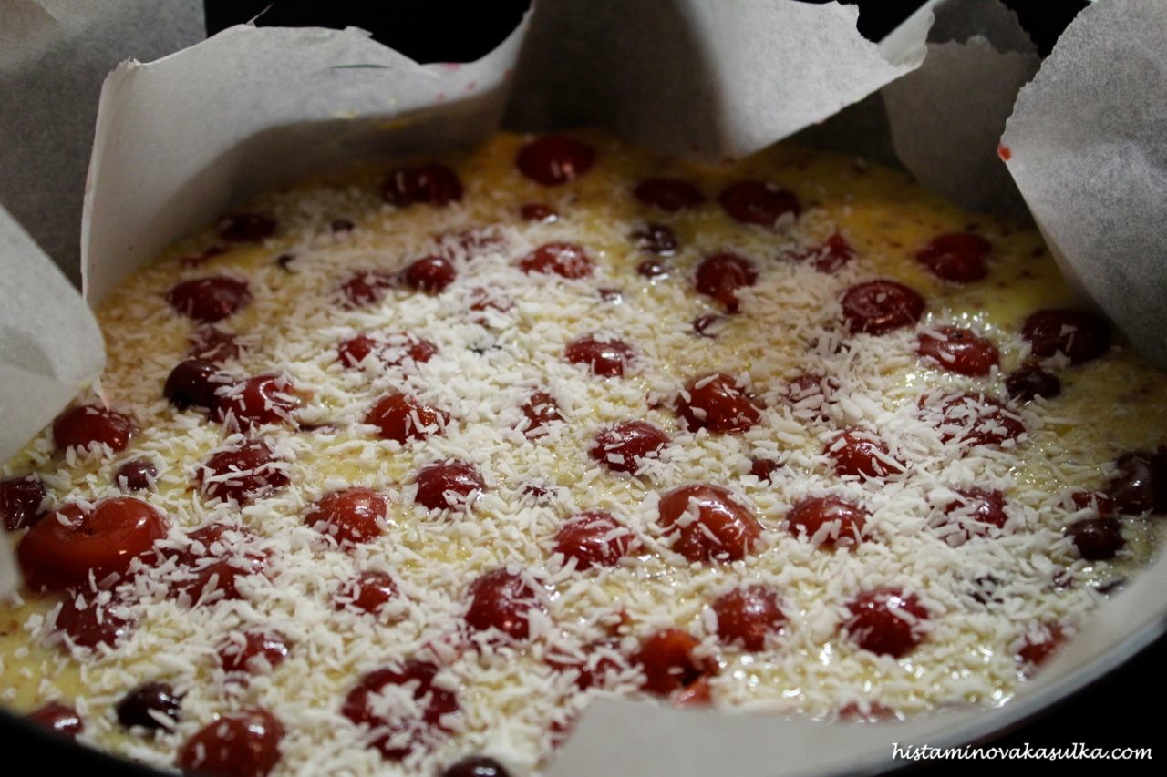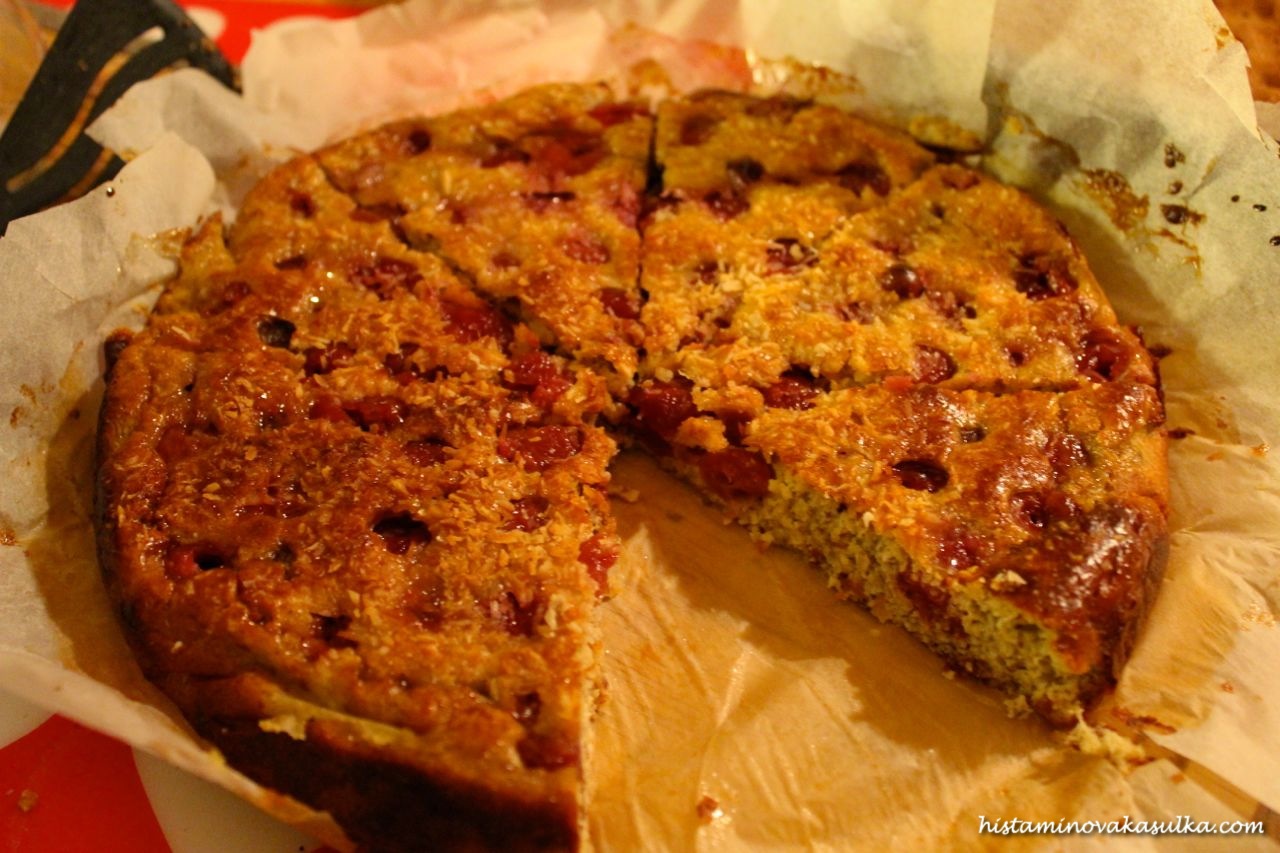 Troubu předehřejeme na 180°C. Na koláč jsem si nachystala dortovou formu, kterou jsem vyložila pečícím papírem. Smícháme si vejce s agávovým sirupem (medem) a případně špetkou vanilky, pokud máte a tolerujete. Přidáme mandle a kokosový krém. Vznikne nám velmi řídké těsto, které přelijeme do nachystané formy. Navrch rozložíme přichystané ovoce. IMG_6453Oct 7, 2013Já jsem použila zavařené třešně (protože mám super maminku), které jsem předem vypeckovala (protože mám ráda svoje zuby). Přidala jsem k tomu i trochu zavařovaného rybízu. Nakonec jsem posypala strouhaným kokosem (protože jej prostě miluju).