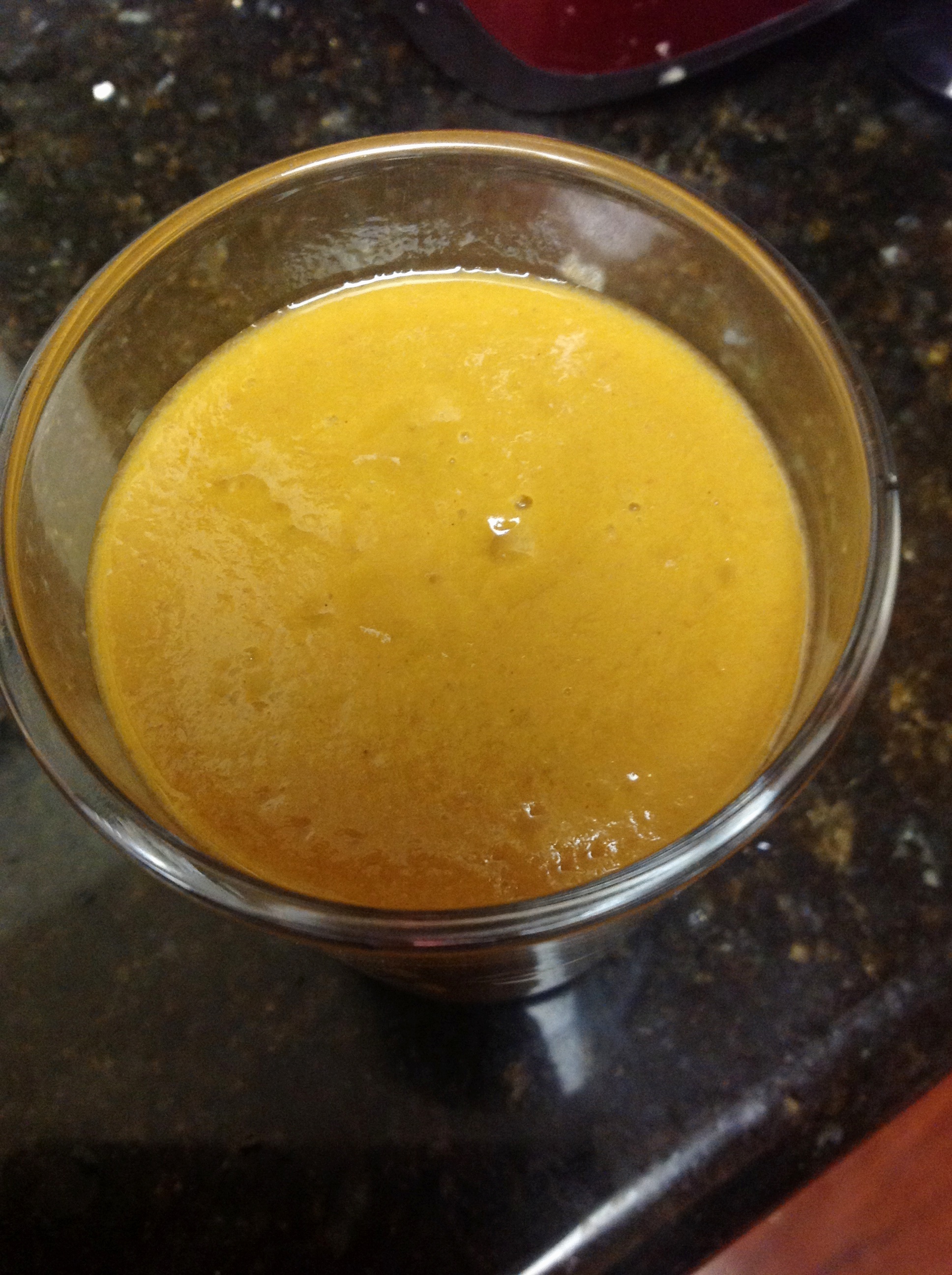 Dobře umytou sladkou bramboru (batát) poduste pod pokličkou cca 45 minut – 1 hodinu v uzavřené pánvi s nepřilnavým povrchem (ideální je nepřilnavý povrch, podlít jen dvěma lžícemi vody a podusit do měkka, pustí se sladká, velmi zdravá lepkavá šťáva). Záleží na typu nádobí, já jsem chvíli dusila a pak nechala pod pokličkou dojít. Uvařenou bramboru i s vydušenou šťávou a zbylými ingrediencemi pořádně rozmixujeme (NELOUPAT). Vodu doplňte dle potřeby, brambora má ale hodně vlákniny a bude tedy tvořit hustou hmotu. Z této dávky mi vyšel celý mixér a cca 3 porce smoothie (vydrželo v lednici beze změny v chuti do odpoledne). Dobrou chuť.