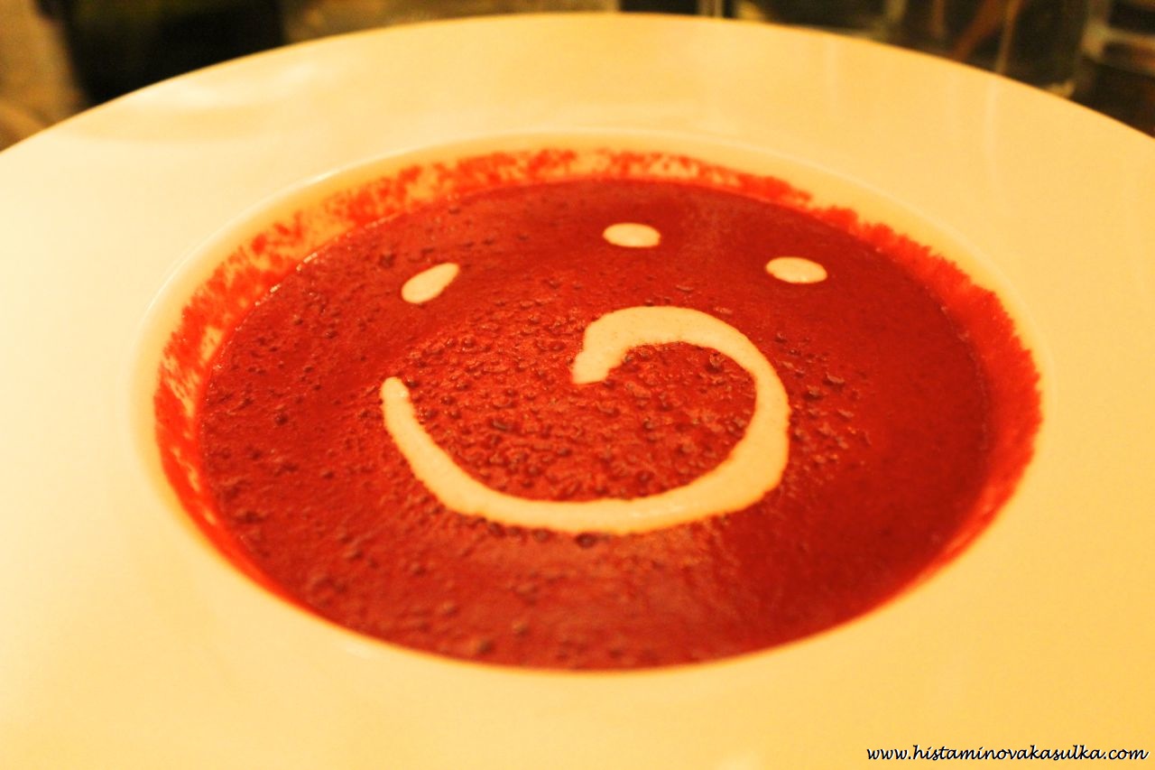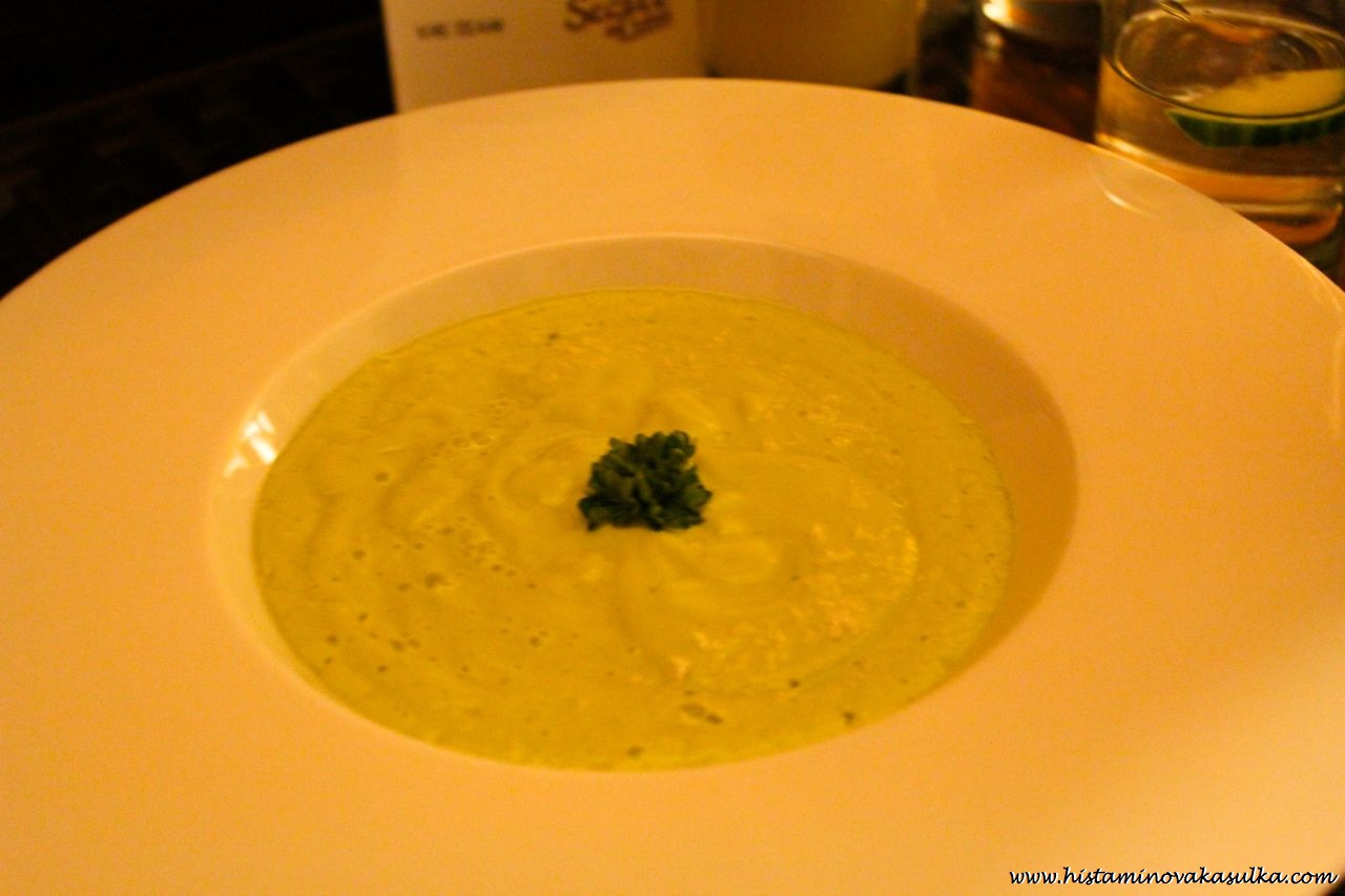 Pak už se začalo servírovat. Nejprve předkrm – můžete si vybrat z předkrmů či polévek, my jsme se pustili do testování řepné polévky (z mandlového mléka a kešu) a kokosovo-avokádové polévky. Dala bych jedničku s hvězdičkou, možná v té avokádové mohlo být méně česneku. I když chuť česneku se prolínala i dalšími pokrmy. Polévky jsou samozřejmě studené, krásně krémové.