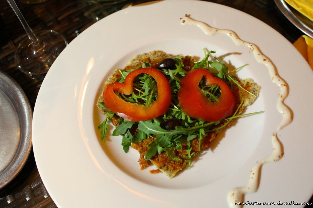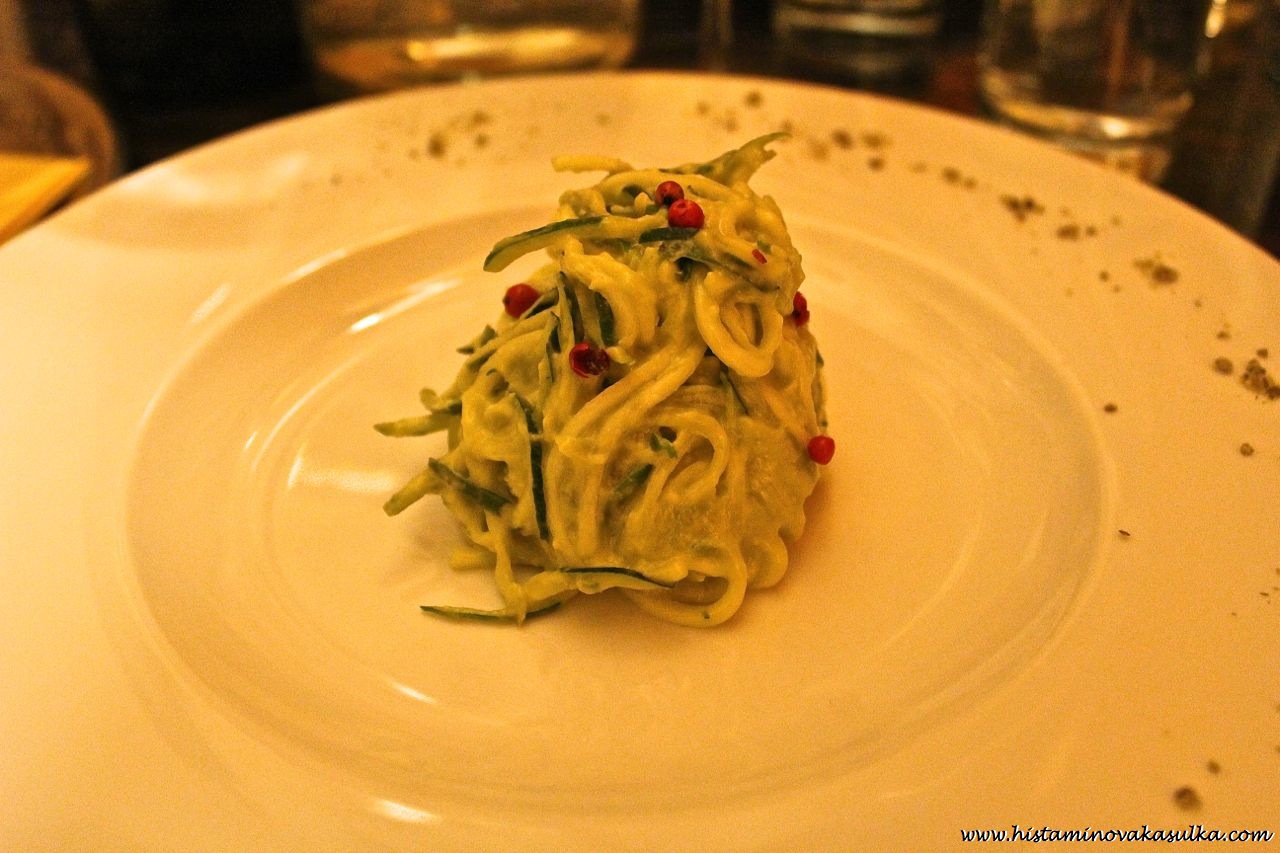 Pak následoval první chod z ochutnávkového setu – cuketové špagety, které byly podávány v „sýrové“ (avokádové) omáčce s velmi silnou chutí rozmarýnu a nakládaným červeným pepřem. Nutno říct, že syrová kuchyně je velmi zajímavá v tom, jak výrazné chuti se vám mísí na talíři. Celkově máte pocit, že vám chutě prostupují celým tělem, příjemně se mísí a zanechávají chuť dobrodružství (prý nemám zmiňovat, že když rozkousnete červený pepř v puse, chutná to jako koberec:)).
