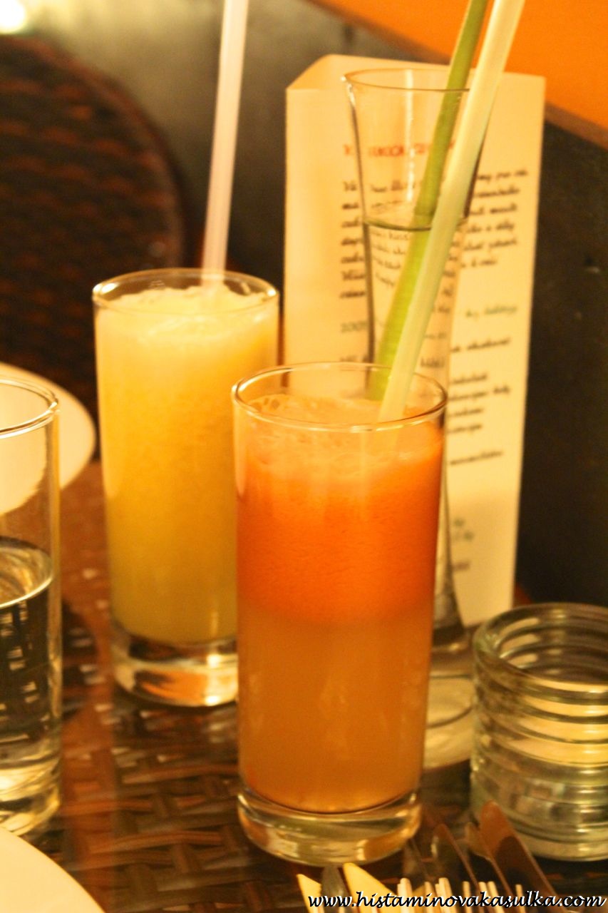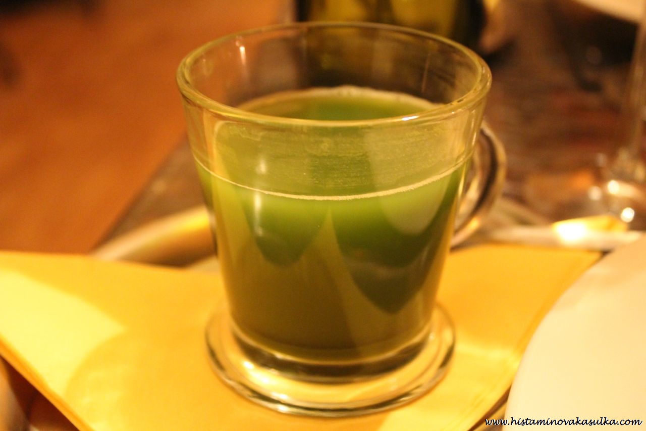 Na začátek nám bylo nabídnuto víno (Jevíněvské vinařství – přírodní víno bez konzervantů atd.), dostali jsme karafu s filtrovanou vodou s okurkou a vybrali jsme si každý své smoothie/fresh juice. Samozřejmě čerstvě připravené. Já bych přidala více zázvoru, který byl v popisu, ale nebyl cítit.