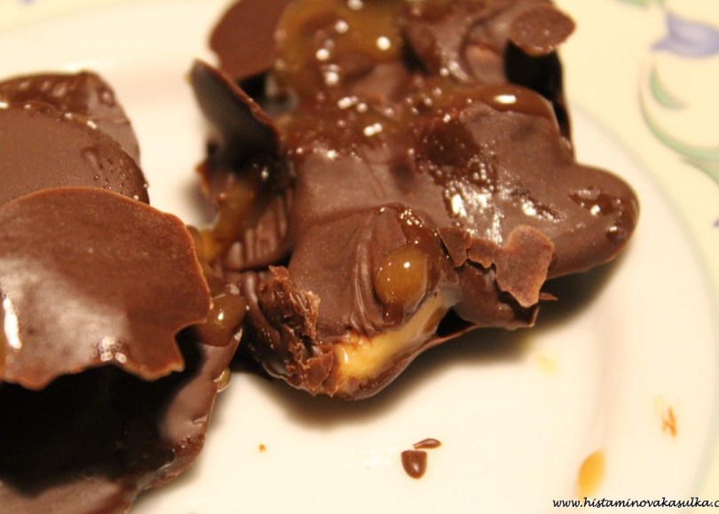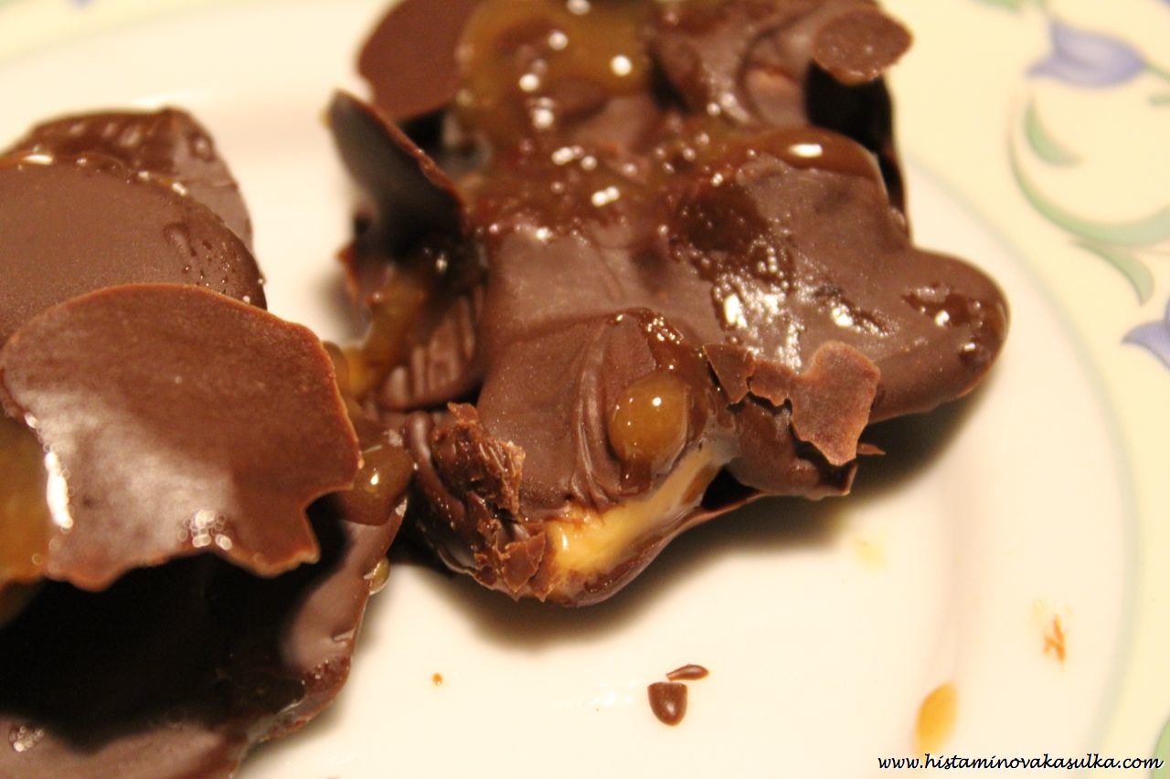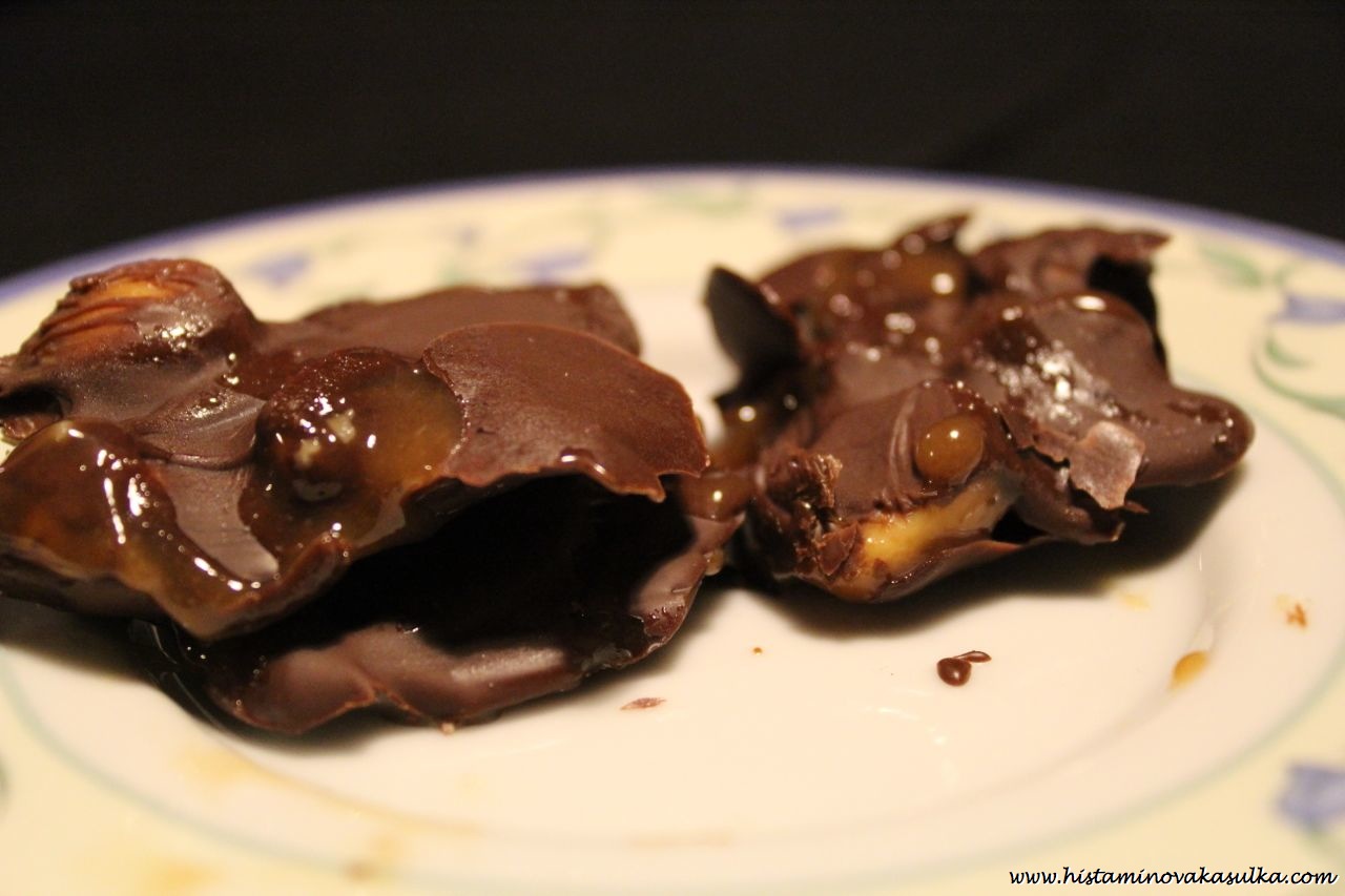 Sejměte z tepla a nechte pozvolna chladnou. Karamel by měl začít tuhnout. Občas promíchejte. Připravte si plech, který vyložíte papírem na pečení (či voskovaným papírem). Jakmile začne karamel tuhnout (pár minut), lžící nabírejte hmotu a vytvořte na papíře hrudky. Vložte do mrazáku (na cca 30 minut). V tuto chvíli je karamel trochu lepivý, ale pokud nemáte rádi čokoládu, můžete podávat i v této podobě. Kombinace medu s arašídovým máslem a ořechy je naprosto skvělá.