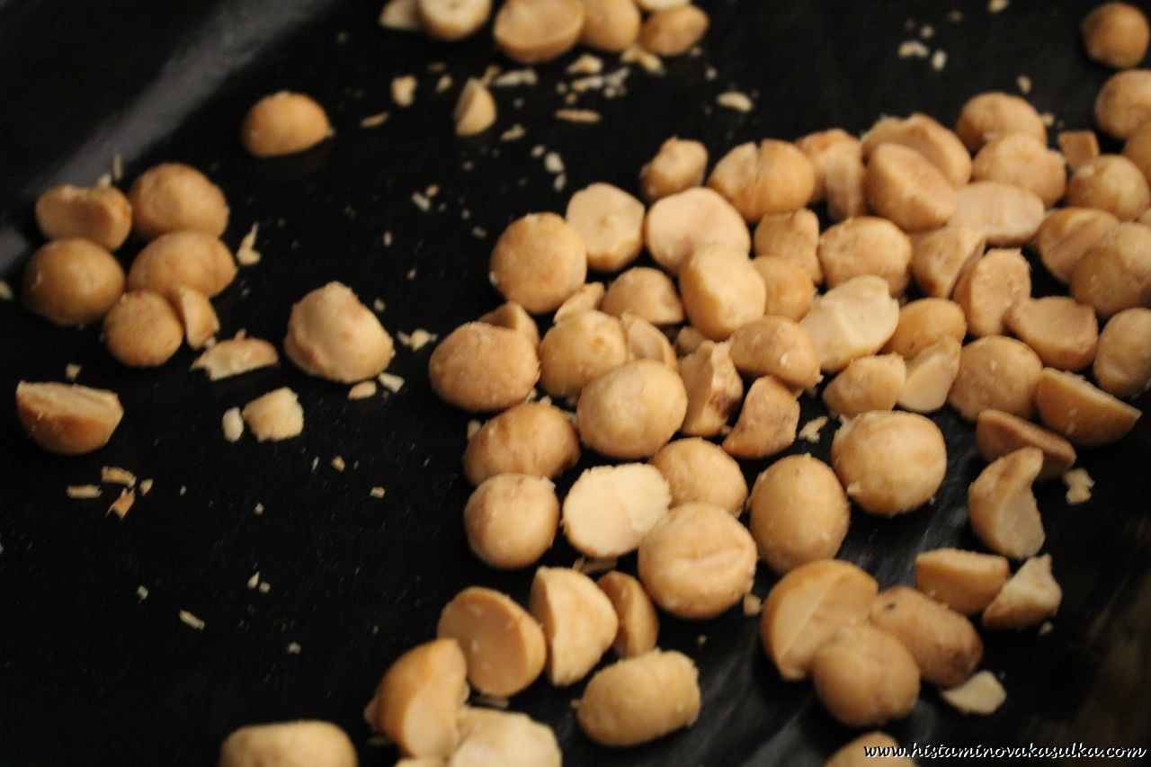 Pro recept je nejlépe využít opražené makadamiové ořechy, které dodají receptu tak trochu jinou chuť. Pokud budete mít jako já solené makadamiové oříšky, tak už do receptu sůl nepřidávejte, jinak přidejte špetku soli do karamelu. Oříšky rozložíme na plech s pečícím papírem, aby měli dostatek místa. Troubu předehřejeme na 150°C a ořechy pak opražíme za občasného obrácení cca 12-15 minut. Oříšky necháme vychladnout.