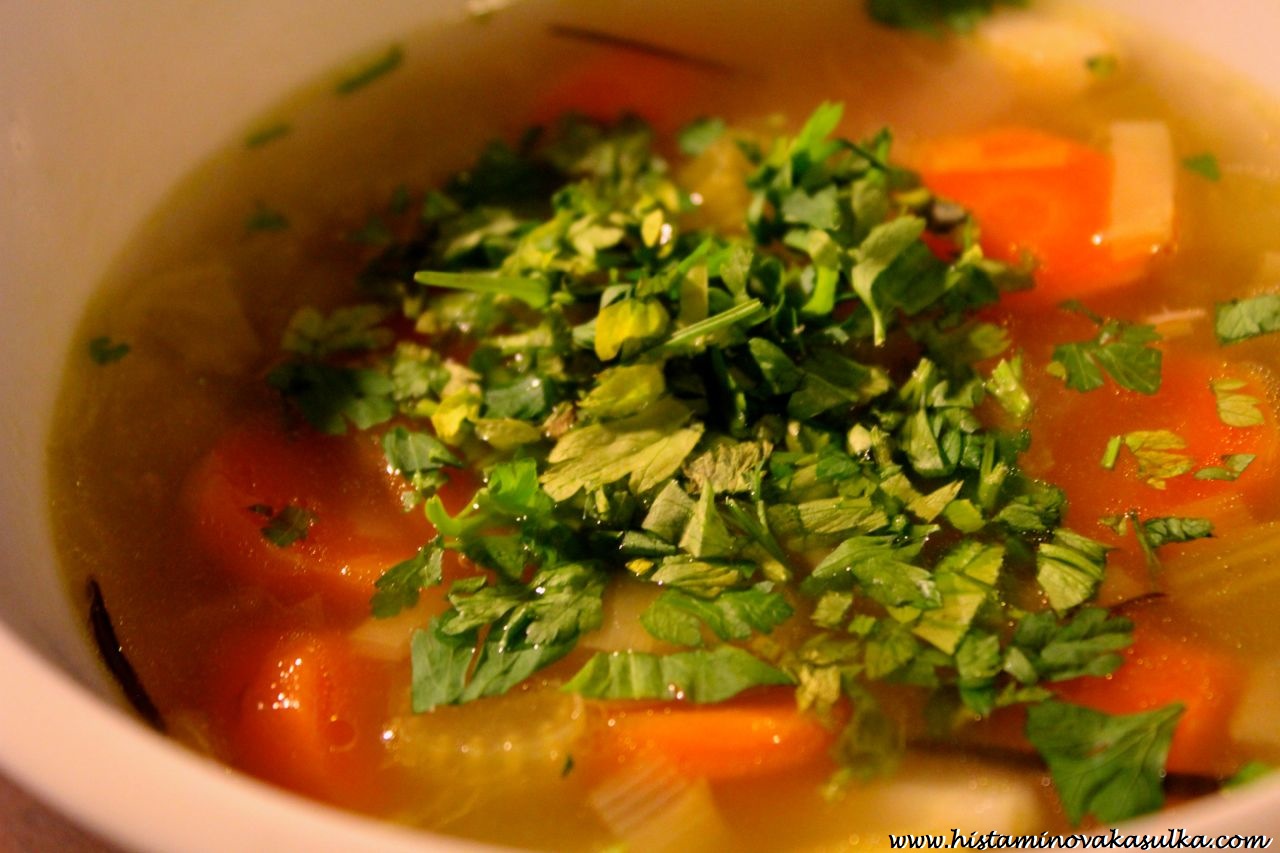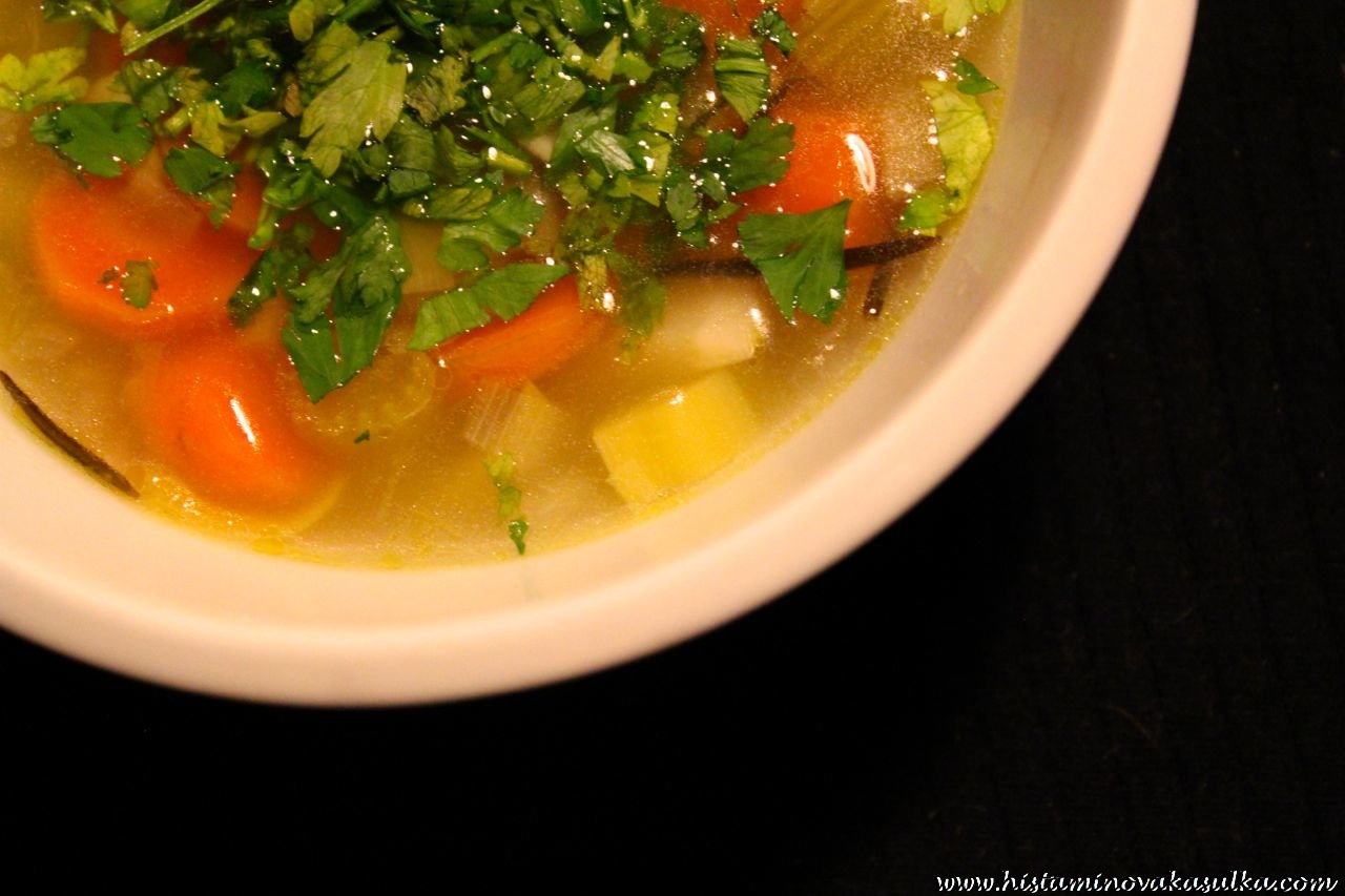 Očista může znamenat cokoliv. Pro někoho je to přísná hladovka po několik dní, pro někoho třeba přidat zeleninu do svého jídelníčku. Každý jsme jiný a naše tělo potřebuje jiný přístup. Důležité však je starat se o tělo pravidelně. Já jsem zvolila “detox” podle Food Matters, ale každý si musí najít svůj způsob. Samozřejmě to není detox jako takový, že byste se zbavovali nějakých škodlivých látek, ale prostě “odpočinek” pro trávení. A aby tělo nedostalo takový šok, zvolila jsem jako přechod na „normální“ stravu lehkou večeři, která tělo zahřeje a ještě pořádně podpoří proudění krve. Takovou horkou zeleninovou polévkou nic nezkazíte ani při nachlazení. Přidejte protizánětlivé bylinky a zeleninu (palec vzhůru pro petržel a celer), trochu zázvoru a bude se vám proti “bacilům” bojovat jedna báseň. Polévka se trochu podobá té “tukožroutské”, což znají hlavně starší generace, ale pár porcí vám tuk vážně neukradne:)