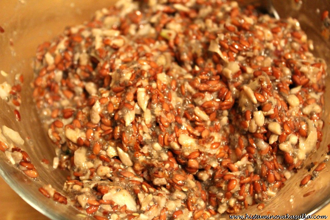 Co se týče složení, můžete vesele experimentovat. Přidat oříšky a semínka, která vám vyhovují, naopak ubrat suroviny, které vám škodí. Základem je len (a z něj vytvořený „sliz“) či chia semínka, zbytek je na vaší fantazii (pro nehistaminiky doporučuji kysané zelí). Pokud máte pomalejší trávení, raději vynechejte čerstvý česnek a přidejte si špetku kurkumy (zajistí stejné protizánětlivé účinky).