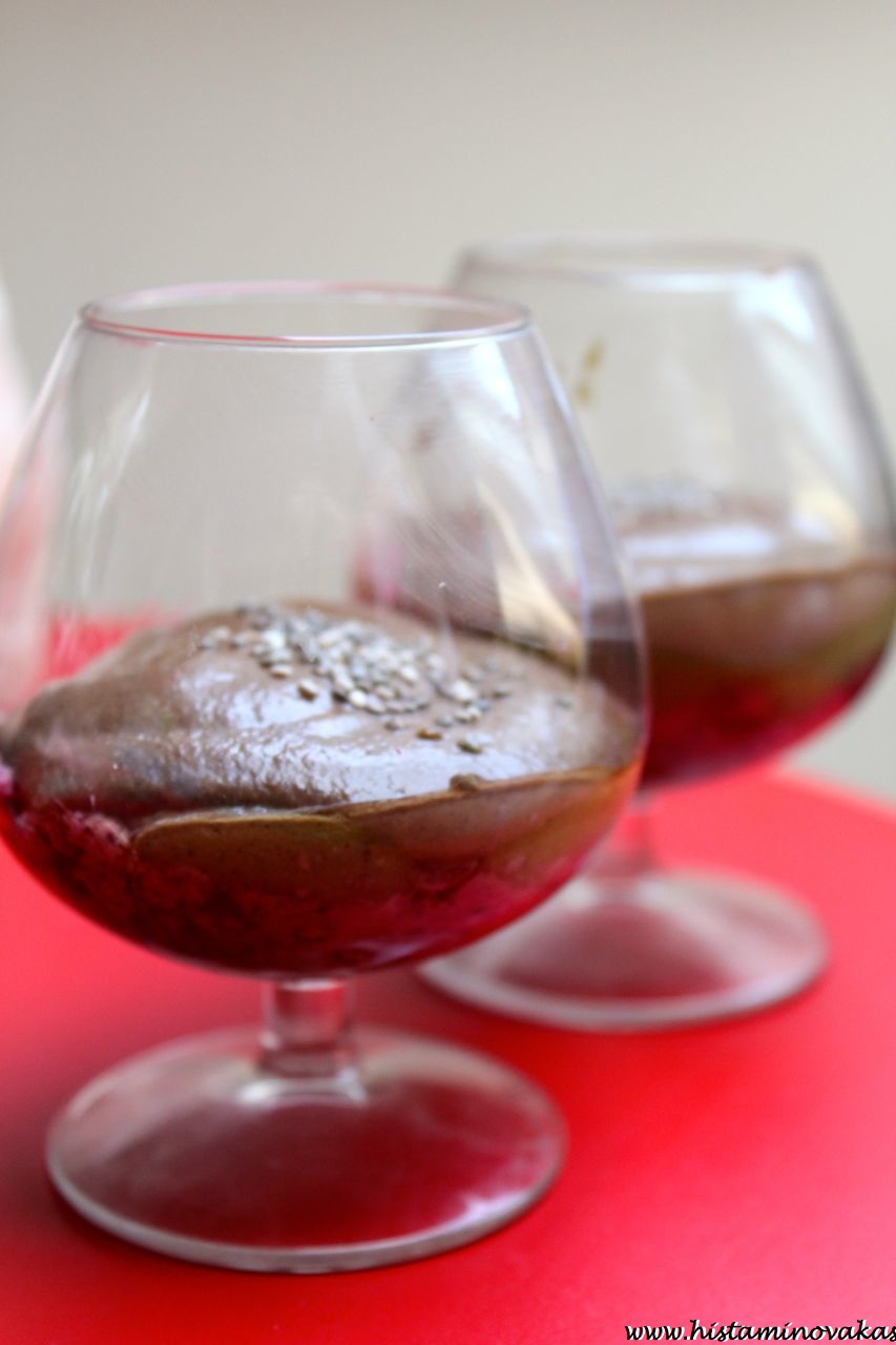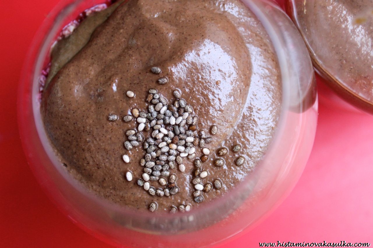 Nejdříve do pohárku na základní vrstvu naneseme zelenou vrstvu a necháme v lednici zatuhnout. Poté naneseme kakaovou vrstvu, posypeme chia semínkem a uložíme v lednici do podávání. Dobrou chuť.