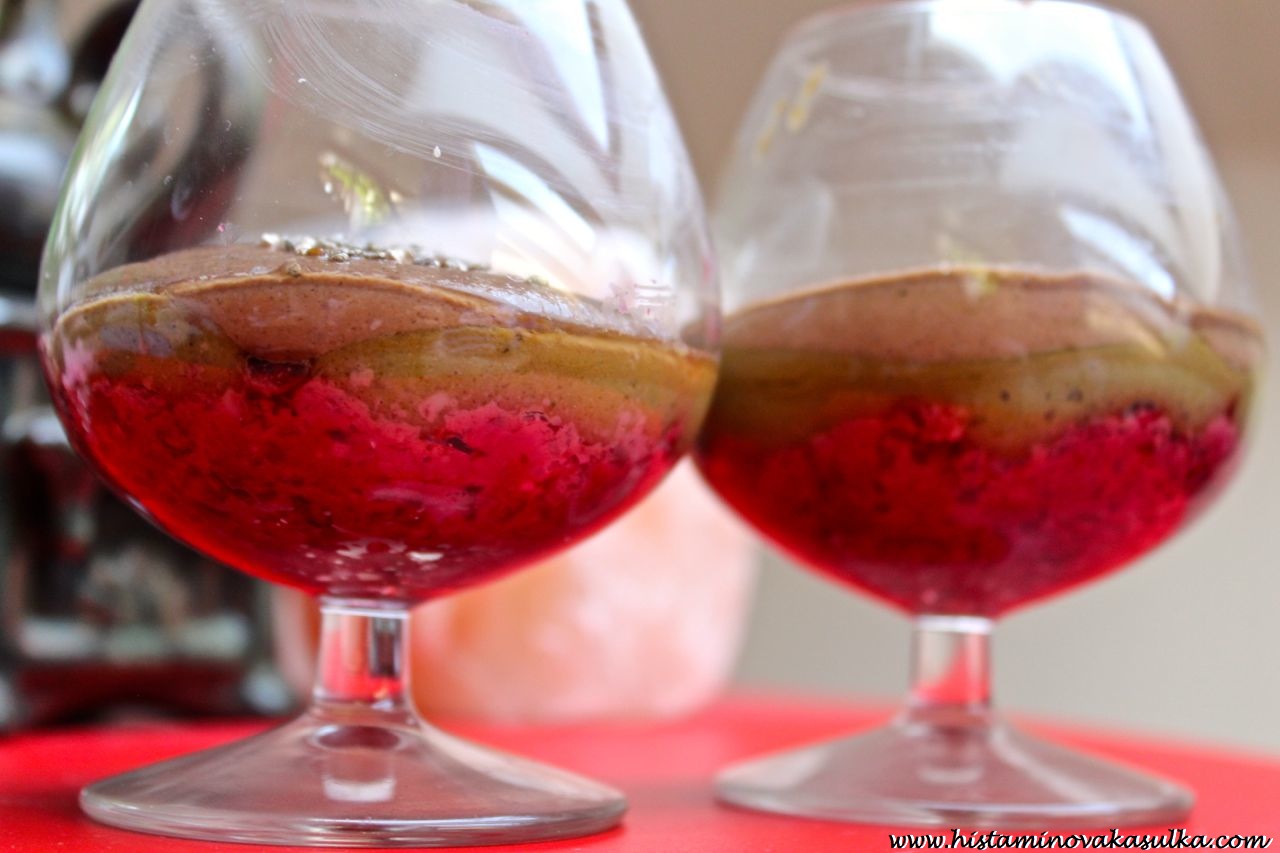 Mandle i vlašské ořechy si předem namočíme. Poté je smícháme v sekáčku spolu s datlemi a přidáme čerstvou ššťávu z červené řepy na dobarvení. Tuto vrstu naneseme do menších skleniček a dáme chladit. Předem namočené kešu rozmixujeme v mixéru s banánem a mandlovým práškem na jemný krém. Půlku krému odebereme a vmícháme do něj matcha prášek, přidáme lžíci agave sirupu. Zbytek krému smícháme s nepraženým kakaovým práškem a můžeme přidat kapku stevie (nemusí být).