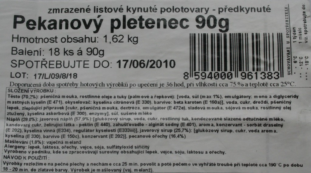 „Například v kornšpicu, který kupujeme pro jeho vysokou výživovou hodnotu, najdeme kromě pšeničné mouky označované ‚1‘, vody, celozrnné pšeničné mouky, celozrnné žitné mouky, sladu, mléka, pražené žitné mouky, lněného semínka, sóji, droždí, soli a koření také přípravek E 300 (kyselina askorbová), emulgátor E 472 (estery mastných kyselin) a prostředek E 262 (octan sodný). Ani složení bílého chleba nevypadá naturálněji. V obyčejné housce a tukovém pečivu sníme kromě pšeničné mouky označené 00 a 0, vody, droždí a soli také tuk. Kromě toho přidávají pekaři do bílého pečiva ještě další přísady jako přípravek E 300 (kyselina askorbová, tj. vitamin C), slad, E 472f (estery mastných kyselin), dextrózu, pšeničný lepek a některé enzymy.“
