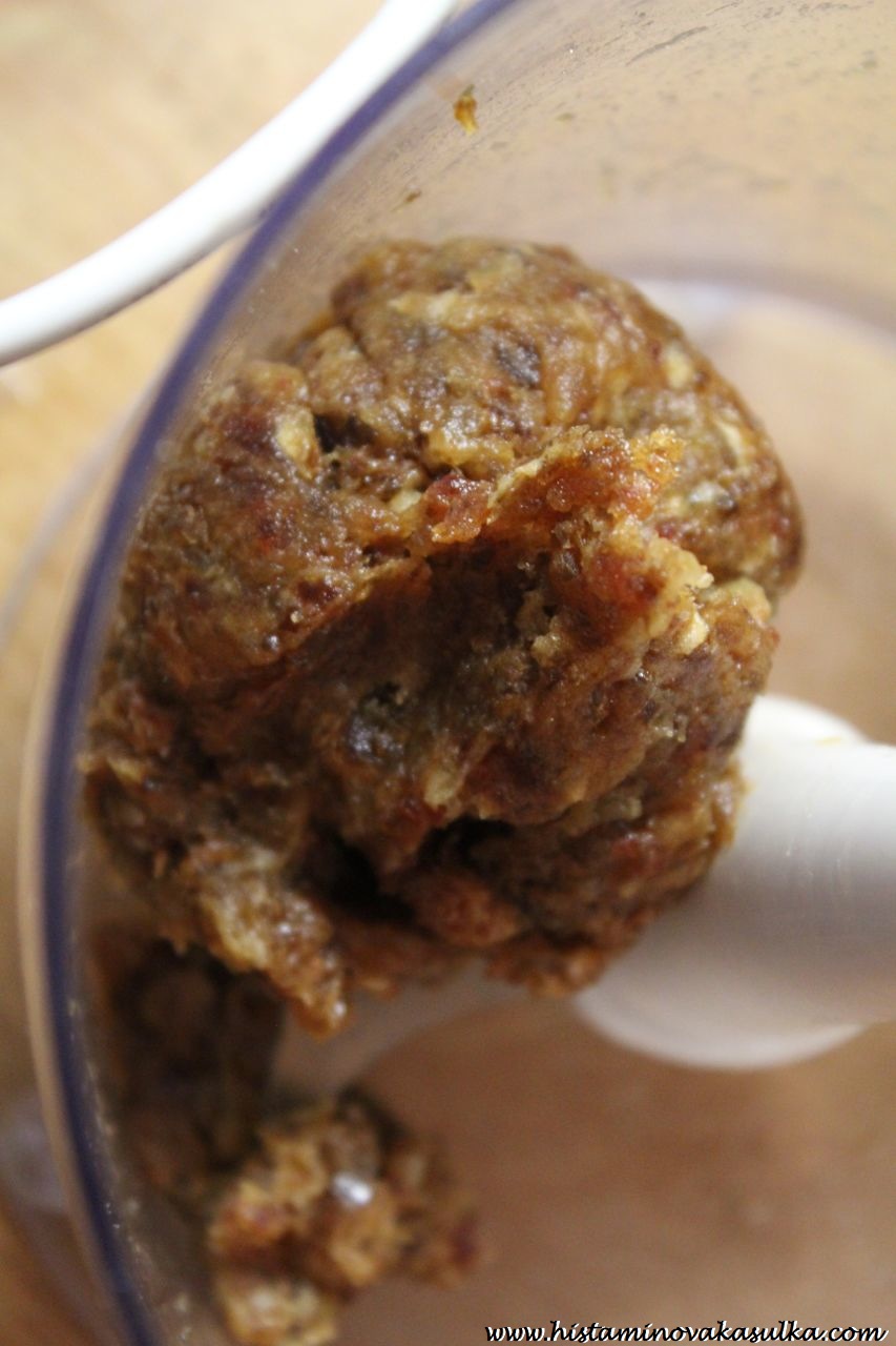 Mandlovou mouku, kakao a kokos smícháme v misce dohromady. V sekáčku nadrobno nasekáme vypeckované datle, až se nám vytvoří datlová hmota.