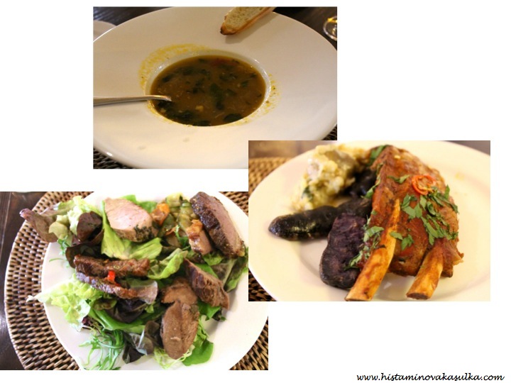 A tím prosím teprve začínáme – masožravci si rozhodně přišli na své, v nabídce se vyskytli pečená žebra s fialovým bramborem, vepřové na tymiánu, roastbeef, krůtí roláda či vepřové v omáčce ze zeleného pepře. Vše bez lepku, jelikož se v kuchyni snaží připravovat pokrmy co nejčistější. Pak byl v nabídce také sicilský mix – bílá ryba, ale tu jsem samozřejmě nezkoušela. Prý to byla lahůdka. Když to tak píšu, zjišťuji, že jsme snad půlku věcí ani neochutnali!