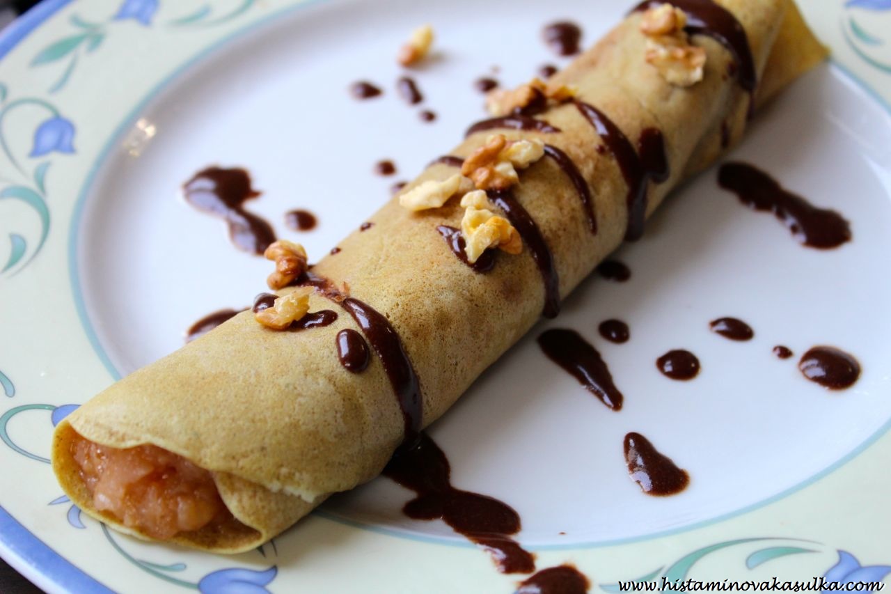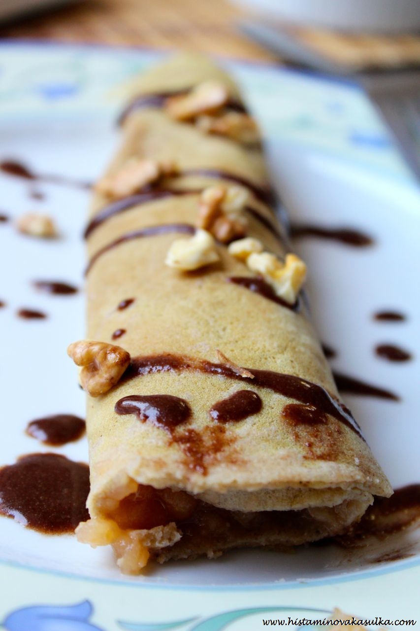 Smícháme si mouky z quinoy a tapioky se sodou a skořicí. Pridáme rozpuštěný kokosový olej a mléko. Vše dobře promícháme. Mělo by vzniknout řidší palačinkové těsto. IMG_9758Nabírala jsem 1/4 hrníčku a rozkroužila na pánev potřenou kokosovým olejem na smažení. Jakmile se začne palačinka po stranách oddělovat (a uprostřed vysoušet, bublinkovat), otočíme a necháme smažit z druhé strany další 2-3 minutky. Z celé dávky jsem dostala 7 palačinek (průměr cca 20 cm?). Palačinky odkládáme mezi dva přivřené talíře, kde se udrží teplé a zároveň ještě trochu „povolí“. IMG_9761Naplníme pak rozdušenými jablíčky, můžeme přidat nasekané vlašské ořechy a zdravější čoko polevu, kterou si jednoduše připravíte z prášku z nepražených kakaových bobů, rozpuštěného kokosového oleje a kapky agave sirupu. Díky tomu, že palačinky neobsahují cukr, dají se velmi chutně plnit i na slano. Doporučuji jíst čerstvé, jsou tak chutnější. Dobrou chuť.  IMG_9771