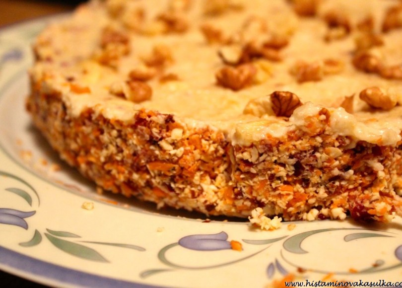 Mezitím si zpracujeme citrónový krém. Namočené kešu s ostatními ingrediencemi vložíme do mixéru a mixujeme a mixujeme a mixujeme. Doporučuji u toho ukusovat zbytek mrkvičky, protože jinak vám také mohou dojít nervy příliš brzy. Dělám si legraci, bude záležet na vašem mixéru, ten můj se nakonec také nechal přemluvit. Poté krém rovnoměrně (v tenké vrstvě) natřeme na korpus a posypeme vlašskými ořechy (nebo čímkoli, co máme rádi).