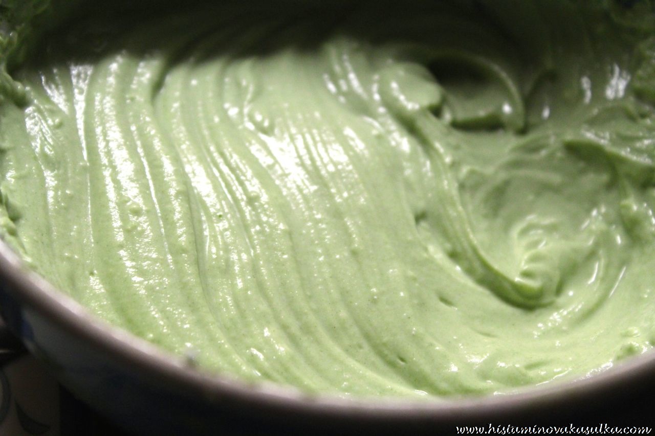 Tvaroh si smícháme s matcha čajem a zvoleným sladidlem. Pokud máte peprmintový extrakt, přidejte max 1/2 lžičky. Pokud budete používat mátové lístky, doporučuji vše zpracovat v robotu, aby se krásně zapracovaly. Přidávejte po lžících vodu, až dostanete krímovitou konzistenci (tedy krém, který půjde roztírat, ale nebude stíkat). Pokud korpus stále nevychladl, uchovejte v lednici.IMG_9896