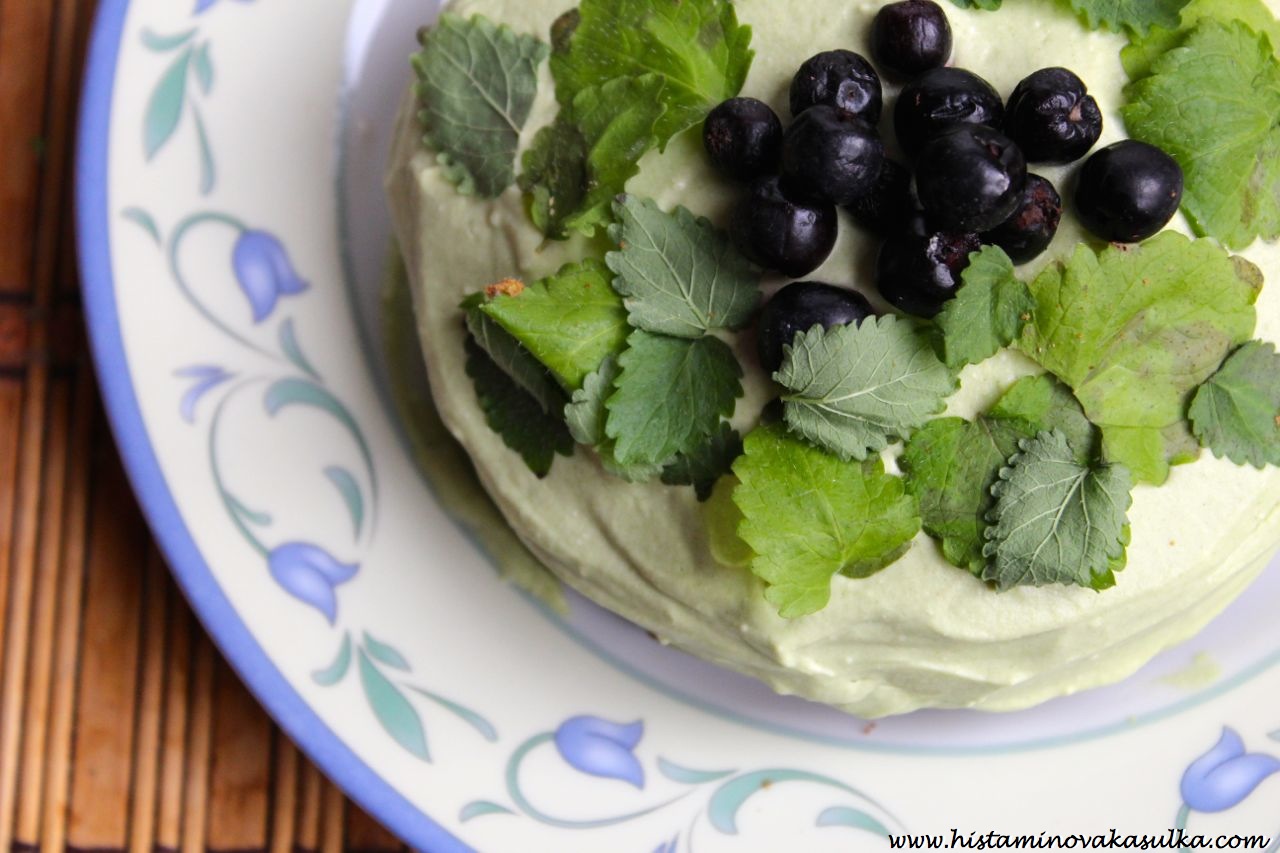 Vychladlý korpus rozkrajte nožem a spodní vrstvu namažte domácí marmeládou.IMG_9891 Poté natřete část krému (cca 1/3-1/2). Přiklopte vrchní částí korpusu a celý dort potřete zbytkem krému. Navrch nasypte meduňkové lístky a můžete přidat barevné ovoce pro kontrast, já jsem použila mraženou aronii. Nechte cca 1 hodinku odležet v lednici. Dobrou chuť.IMG_9915