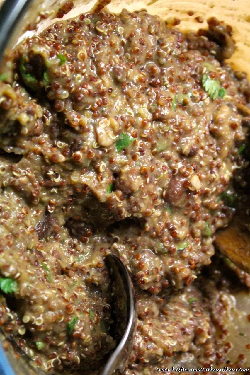 Troubu předehřejem na 180°C. Dýňové pyré smícháme s vařenými fazolemi a lehce promixujeme (ne moc, aby zůstaly kousky fazolí). Vznikne hustší těstovitá hmota. Vmícháme všechno koření, nasekaný koriandr a nakonec přidáme lehce vychladlou uvařenou quinou.